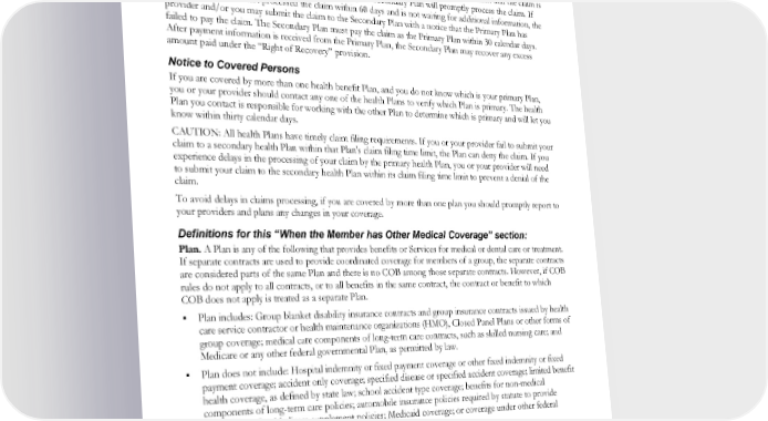 first is called the Primary Plan. The Primary Plan must pay benefits in accordance with its contract terms without regard to the possibility that another Plan may cover some expenses. The Plan that pays after the Primary Plan is the Secondary Plan. The Secondary Plan may reduce the benefits it pays so that payments from all Plans do not exceed 100 percent of the total Allowable Expense. If the Secondary Plan receives a claim without the Primary Plan’s payment details, the Secondary Plan will notify the submitting provider and/or you as soon as possible and within 30 days of receipt of the claim that the claim is incomplete. After receiving the missing information, the Secondary Plan will promptly process the claim. If the Primary Plan has not processed the claim within 60 days and is not waiting for additional information, the provider and/or you may submit the claim to the Secondary Plan with a notice that the Primary Plan has failed to pay the claim. The Secondary Plan must pay the claim as the Primary Plan within 30 calendar days. After payment information is received from the Primary Plan, the Secondary Plan may recover any excess amount paid under the “Right of Recovery” provision. Notice to Covered Persons If you are covered by more than one health benefit Plan, and you do not know which is your primary Plan, you or your provider should contact any one of the health Plans to verify which Plan is primary. The health Plan you contact is responsible for working with the other Plan to determine which is primary and will let you know within thirty calendar days. CAUTION: All health Plans have timely claim filing requirements. If you or your provider fail to submit your claim to a secondary health Plan within that Plan's claim filing time limit, the Plan can deny the claim. If you experience delays in the processing of your claim by the primary health Plan, you or your provider will need to submit your claim to the secondary health Plan within its claim filing time limit to prevent a denial of the claim. To avoid delays in claims processing, if you are covered by more than one plan you should promptly report to your providers and plans any changes in your coverage. Definitions for this “When the Member has Other Medical Coverage” section: Plan. A Plan is any of the following that provides benefits or Services for medical or dental care or treatment. If separate contracts are used to provide coordinated coverage for members of a group, the separate contracts are considered parts of the same Plan and there is no COB among those separate contracts. However, if COB rules do not apply to all contracts, or to all benefits in the same contract, the contract or benefit to which COB does not apply is treated as a separate Plan. Plan includes: Group blanket disability insurance contracts and group insurance contracts issued by health care service contractor or health maintenance organizations (HMO), Closed Panel Plans or other forms of group coverage; medical care components of long-term care contracts, such as skilled nursing care; and Medicare or any other federal governmental Plan, as permitted by law. Plan does not include: Hospital indemnity or fixed payment coverage or other fixed indemnity or fixed payment coverage; accident only coverage; specified disease or specified accident coverage; limited benefit health coverage, as defined by state law; school accident type coverage; benefits for non-medical components of long-term care policies; automobile insurance policies required by statute to provide medical benefits; Medicare supplement policies; Medicaid coverage; or coverage under other federal governmental Plans, unless permitted by law. Each contract for coverage is a separate Plan. If a Plan has two parts and COB rules apply only to one of the two, each of the parts is treated as a separate Plan. This Plan. This Plan means the part of the contract providing the health care benefits to which the COB provision applies, and which may be reduced because of the benefits of other Plans. Any other part of the contract providing health care benefits is separate from This Plan. A contract may apply one COB provision EWCLGHDHP1983ACT0124 77 WAPEBB-CD-ACT