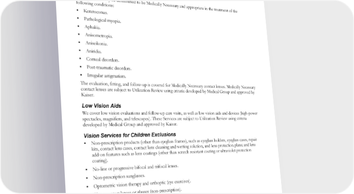 One conventional contact lens, or a 6-month supply of disposable contact lenses, determined by your Participating Provider for each eye on which you had cataract surgery, and fitting and follow-up care for the lens. One pair of regular eyeglass lenses determined by your Participating Provider and a frame from a specified selection of frames. Medically Necessary Contact Lenses Contact lenses may be determined to be Medically Necessary and appropriate in the treatment of the following conditions: Keratoconus. Pathological myopia. Aphakia. Anisometropia. Aniseikonia. Aniridia. Corneal disorders. Post-traumatic disorders. Irregular astigmatism. The evaluation, fitting, and follow-up is covered for Medically Necessary contact lenses. Medically Necessary contact lenses are subject to Utilization Review using criteria developed by Medical Group and approved by Kaiser. Low Vision Aids We cover low vision evaluations and follow-up care visits, as well as low vision aids and devices (high-power spectacles, magnifiers, and telescopes). These Services are subject to Utilization Review using criteria developed by Medical Group and approved by Kaiser. Vision Services for Children Exclusions Non-prescription products (other than eyeglass frames), such as eyeglass holders, eyeglass cases, repair kits, contact lens cases, contact lens cleaning and wetting solution, and lens protection plans; and lens add-on features such as lens coatings (other than scratch resistant coating or ultraviolet protection coating). No-line or progressive bifocal and trifocal lenses. Non-prescription sunglasses. Optometric vision therapy and orthoptic (eye exercises). Plano contact lenses or glasses (non-prescription). Replacement of lost, broken, or damaged lenses or frames. Two pairs of glasses in lieu of bifocals. BENEFIT EXCLUSIONS AND LIMITATIONS In addition to any exclusions listed in “Benefit Details,” this Plan does not cover the following: EWCLGHDHP1983ACT0124 73 WAPEBB-CD-ACT