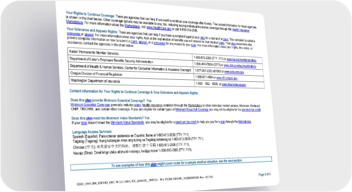 Your Rights to Continue Coverage: There are agencies that can help if you want to continue your coverage after it ends. The contact information for those agencies is shown in the chart below. Other coverage options may be available to you, too, including buying individual insurance coverage through the Health Insurance Marketplace. For more information about the Marketplace, visit www.HealthCare.gov or call 1-800-318-2596. Your Grievance and Appeals Rights: There are agencies that can help if you have a complaint against your plan for a denial of a claim. This complaint is called a grievance or appeal. For more information about your rights, look at the explanation of benefits you will receive for that medical claim. Your plan documents also provide complete information on how to submit a claim, appeal, or a grievance for any reason to your plan. For more information about your rights, this notice, or assistance, contact the agencies in the chart below. Kaiser Permanente Member Services 1-800-813-2000 (TTY: 711) or www.kp.org/memberservices Department of Labor’s Employee Benefits Security Administration 1-866-444-EBSA (3272) or www.dol.gov/ebsa/healthreform Department of Health & Human Services, Center for Consumer Information & Insurance Oversight 1-877-267-2323 x61565 or www.cciio.cms.gov Oregon Division of Financial Regulation 1-888-877-4894 or www.dfr.oregon.gov 1-800 562 6900 or www.insurance.wa.gov Washington Department of Insurance ‑ ‑ Contact Information for Your Rights to Continue Coverage & Your Grievance and Appeals Rights: Does this plan provide Minimum Essential Coverage? Yes Minimum Essential Coverage generally includes plans, health insurance available through the Marketplace or other individual market policies, Medicare, Medicaid, CHIP, TRICARE, and certain other coverage. If you are eligible for certain types of Minimum Essential Coverage you may not be eligible for the premium tax credit. Does this plan meet the Minimum Value Standards? Yes If your plan doesn’t meet the Minimum Value Standards, you may be eligible for a premium tax credit to help you pay for a plan through the Marketplace. Language Access Services: Spanish (Español): Para obtener asistencia en Español, llame al 1-800-813-2000 (TTY: 711). Tagalog (Tagalog): Kung kailangan ninyo ang tulong sa Tagalog tumawag sa 1-800-813-2000 (TTY: 711). Chinese (中文): 如果需要中文的帮助,请拨打这个号码 1-800-813-2000 (TTY: 711). Navajo (Dine): Dinek'ehgo shika at'ohwol ninisingo, kwiijigo holne' 1-800-813-2000 (TTY: 711). To see examples of how this plan might cover costs for a sample medical situation, see the next section. 12024_1983-204_KWHD_SBC-W-LG-HSA-XX_{666621}_{WPH4 - WA PEBB HDHP}_9122023153218 Rev. (11/16) Page 5 of 6