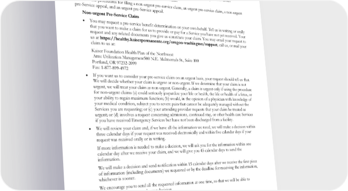 Pre-Service Claims and Appeals Pre-Service claims are requests that we provide or pay for a Service that you have not yet received. Failure to receive authorization before receiving a Service that must be authorized in order to be a covered benefit may be the basis for our denial of your pre-Service claim or a post-Service claim for payment. If you receive any of the Services you are requesting before we make our decision, your pre-Service claim or appeal will become a post-Service claim or appeal with respect to those Services. If you have any general questions about pre-service claims or appeals, please contact Member Services. Here are the procedures for filing a non-urgent pre-service claim, an urgent pre-service claim, a non-urgent pre-Service appeal, and an urgent pre-Service appeal. Non-urgent Pre-Service Claim • You may request a pre-service benefit determination on your own behalf. Tell us in writing or orally that you want to make a claim for us to provide or pay for a Service you have not yet received. Your request and any related documents you give us constitute your claim. You may email your request to us at https://healthy.kaiserpermanente.org/oregon-washington/support, call us, or mail your claim to us at: Kaiser Foundation Health Plan of the Northwest Attn: Utilization Management500 N.E. Multnomah St., Suite 100 Portland, OR 97232-2099 Fax: 1-877-899-4972 • If you want us to consider your pre-service claim on an urgent basis, your request should tell us that. We will decide whether your claim is urgent or non-urgent. If we determine that your claim is not urgent, we will treat your claim as non-urgent. Generally, a claim is urgent only if using the procedure for non-urgent claims (a) could seriously jeopardize your life or health, the life or health of a fetus, or your ability to regain maximum function; (b) would, in the opinion of a physician with knowledge of your medical condition, subject you to severe pain that cannot be adequately managed without the Services you are requesting; or (c) your attending provider requests that your claim be treated as urgent; or (d) involves a request concerning admissions, continued stay, or other health care Services if you have received Emergency Services but have not been discharged from a facility. • We will review your claim and, if we have all the information we need, we will make a decision within three calendar days if your request was received electronically and within five calendar days if your request was received orally or in writing. If more information is needed to make a decision, we will ask you for the information within one calendar day after we receive your claim, and we will give you 45 calendar days to send the information. We will make a decision and send notification within 15 calendar days after we receive the first piece of information (including documents) we requested or by the deadline for receiving the information, whichever is sooner. We encourage you to send all the requested information at one time, so that we will be able to consider it all when we make our decision. • We will send written notice of our decision to you, and if applicable, to your provider. Urgent Pre-service Claim • If your pre-service claim was considered on an urgent basis, we will make a decision within one calendar day if your request was received electronically and within two calendar days if your request was received orally or in writing. EWCLGDED1983ACT0124 86 WAPEBB-CL-ACT
