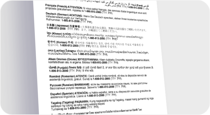 አማርኛ (Amharic) ማስታወሻ: የሚናገሩት ቋንቋ ኣማርኛ ከሆነ የትርጉም እርዳታ ድርጅቶች፣ በነጻ ሊያግዝዎት ተዘጋጀተዋል፡ ወደ ሚከተለው ቁጥር ይደውሉ 1-800-813-2000 (TTY: 711). مﻗرﺑ لﺻﺗا .نﺎﺟﻣﻟﺎﺑ كﻟ رﻓاوﺗﺗ ﺔﯾوﻐﻠﻟا ةدﻋﺎﺳﻣﻟا تﺎﻣدﺧ نﺈﻓ ،ﺔﯾﺑرﻌﻟا ثدﺣﺗﺗ تﻧﻛ اذإ :ﺔظوﺣﻠﻣ (Arabic) ﺔﯾﺑرﻌﻟا .(711 :TTY) 1-800-813-2000 中文 (Chinese) 注意:如果您使用繁體中文,您可以免費獲得語言援助服務。請致電1-800-813-2000 (TTY:711)。 ﯽﻣ مھارﻓ ﺎﻣﺷ یارﺑ نﺎﮕﯾار تروﺻﺑ ﯽﻧﺎﺑز تﻼﯾﮭﺳﺗ ،دﯾﻧﮐ ﯽﻣ وﮕﺗﻔﮔ ﯽﺳرﺎﻓ نﺎﺑز ﮫﺑ رﮔا :ﮫﺟوﺗ (Farsi) ﯽﺳرﺎﻓ . دﯾرﯾﮕﺑ سﺎﻣﺗ (711 :TTY) 1-800-813-2000 ﺎﺑ .دﺷﺎﺑ Français (French) ATTENTION: Si vous parlez français, des services d'aide linguistique vous sont proposés gratuitement. Appelez le 1-800-813-2000 (TTY: 711). Deutsch (German) ACHTUNG: Wenn Sie Deutsch sprechen, stehen Ihnen kostenlos sprachliche Hilfsdienstleistungen zur Verfügung. Rufnummer: 1-800-813-2000 (TTY: 711). 日本語 (Japanese) 注意事項:日本語を話される場合、無料の言語支援をご利用いただけます。 1-800-813-2000(TTY: 711)まで、お電話にてご連絡ください。 ែខ� រ (Khmer) ្របយ័ត�៖ េបើសិន�អ�កនិ�យ ��ែខ�រ, េស�ជំនួយែផ�ក�� េ�យមិនគិតឈ� ល� គឺ�ច�នសំ�ប់បំេរអ� �ក។ ចូរ ទូរស័ព� 1-800-813-2000 (TTY: 711)។ 한국어 (Korean) 주의: 한국어를 사용하시는 경우, 언어 지원 서비스를 무료로 이용하실 수 있습니다. 1-800-813-2000 (TTY: 711) 번으로 전화해 주십시오. ້ ່ ລາວ (Laotian) ໂປດຊາບ: ຖ້າວ່າ ທ່ານເວົ າພາສາ ລາວ, ການບໍ ລິ ການຊ່ວຍເຫືຼ ອດ້ານພາສາ, ໂດຍບໍ ເສັ ຽຄ່າ, ແມ່ນມີ ພ້ອມໃຫ້ທ່ານ. ໂທຣ 1-800-813-2000 (TTY: 711). Afaan Oromoo (Oromo) XIYYEEFFANNAA: Afaan dubbattu Oroomiffa, tajaajila gargaarsa afaanii, kanfaltiidhaan ala, ni argama. Bilbilaa 1-800-813-2000 (TTY: 711). ਪੰ ਜਾ ਬ ੀ (Punjabi) ਿਧਆਨ ਿਦਓ: ਜੇ ਤਸੁ � ਪੰਜਾਬੀ ਬੋਲਦੇ ਹੋ, ਤ� ਭਾਸ਼ਾ ਿਵੱਚ ਸਹਾਇਤਾ ਸਵੇ ਾ ਤੁਹਾਡੇ ਲਈ ਮੁਫਤ ਉਪਲਬਧ ਹੈ। 1-800-813-2000 (TTY: 711) 'ਤੇ ਕਾਲ ਕਰੋ। Română (Romanian) ATENȚIE: Dacă vorbiți limba română, vă stau la dispoziție servicii de asistență lingvistică, gratuit. Sunați la 1-800-813-2000 (TTY: 711). Pусский (Russian) ВНИМАНИЕ: если вы говорите на русском языке, то вам доступны бесплатные услуги перевода. Звоните 1-800-813-2000 (TTY: 711). Español (Spanish) ATENCIÓN: si habla español, tiene a su disposición servicios gratuitos de asistencia lingüística. Llame al 1-800-813-2000 (TTY: 711). Tagalog (Tagalog) PAUNAWA: Kung nagsasalita ka ng Tagalog, maaari kang gumamit ng mga serbisyo ng tulong sa wika nang walang bayad. Tumawag sa 1-800-813-2000 (TTY: 711). ้ ่ ไทย (Thai) เรยี น: ถาค้ ณุ พูดภาษาไทย คณุ สามารถใชบรกิ ารชวยเหลอื ทางภาษาไดฟ้ ร ี โทร 1-800-813-2000 (TTY: 711). Українська (Ukrainian) УВАГА! Якщо ви розмовляєте українською мовою, ви можете звернутися до безкоштовної служби мовної підтримки. Телефонуйте за номером 1-800-813-2000 (TTY: 711). Tiếng Việt (Vietnamese) CHÚ Ý: Nếu bạn nói Tiếng Việt, có các dịch vụ hỗ trợ ngôn ngữ miễn phí dành cho bạn. Gọi số 1-800-813-2000 (TTY: 711). EWCLGDED1983ACT0124 97 WAPEBB-CL-ACT