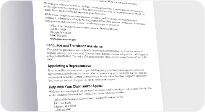 After you notify us of a complaint, this is what happens: A representative reviews the complaint and conducts an investigation, verifying all the relevant facts. The representative or a physician evaluates the facts and makes a recommendation for corrective action, if any. When you file a complaint, we will respond within 30 calendar days. Grievance determinations are not adverse benefit determinations. There is not an appeal process for grievance determinations. We want you to be satisfied with our facilities, Services, and providers. Using this grievance procedure gives us the opportunity to correct any problems that keep us from meeting your expectations and your health care needs. If you are dissatisfied for any reason, please let us know. While we encourage you to use our grievance procedure, you have the right to contact Washington’s designated ombudsman’s office, the Washington State Office of the Insurance Commissioner, for assistance with questions and complaints. Contact them by mail, telephone or online at: Office of the Insurance Commissioner, Consumer Protection Division P.O. Box 40256 Olympia, WA 98504 1-800-562-6900 www.insurance.wa.gov Language and Translation Assistance If we send you grievance or adverse benefit determination correspondence, we will include a notice of language assistance (oral translation). You may request language assistance with your claim and/or appeal by calling 1-800-324-8010. The notice of language assistance “Help in Your Language” is also included in this EOC. Appointing a Representative If you would like someone to act on your behalf regarding your claim, you may appoint an authorized representative, an individual who by law or by your consent may act on your behalf. You must make this appointment in writing. Contact Member Services for information about how to appoint a representative. You must pay the cost of anyone you hire to represent or help you. Help with Your Claim and/or Appeal While you are encouraged to use our appeal procedures, you have the right to seek assistance from the Office of the Insurance Commissioner. Contact them by mail, telephone, or online at: Office of the Insurance Commissioner, Consumer Protection Division P.O. Box 40256 Olympia, WA 98504 1-800-562-6900 www.insurance.wa.gov Reviewing Information Regarding Your Claim If you want to review the information that we have collected regarding your claim, you may request, and we will provide without charge, copies of all relevant documents, records, and other information (including complete medical necessity criteria, benefit provisions, guidelines, or protocols) used to make a denial determination. You also have the right to request any diagnosis and treatment codes and their meanings that are the subject of your claim. To make a request, you should contact Member Services. EWCLGDED1983ACT0124 84 WAPEBB-CL-ACT