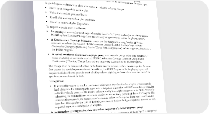 Special Open Enrollment Changes A Subscriber may change their enrollment outside of the Annual Open Enrollment period if a qualifying event creates a special open enrollment period. However, the change in enrollment must be allowable under Internal Revenue Code (IRC) and Treasury Regulations and correspond to and be consistent with the event that creates the special open enrollment for the Subscriber, their Dependent, or both. A special open enrollment event must be other than an employee gaining initial eligibility or regaining eligibility for PEBB benefits. The Subscriber must provide evidence of the event that created the special open enrollment. A special open enrollment may allow a Subscriber to make the following changes: Enroll in or change their medical plan Waive their medical plan enrollment Enroll after waiving medical plan enrollment Enroll or remove eligible Dependents To request a special open enrollment: An employee must make the change online using Benefits 24/7 (once available) or submit the required PEBB Employee Enrollment/Change form and any supporting documents to their Employing Agency. A Continuation Coverage Subscriber must make the change online using Benefits 24/7 (once available) or submit the required PEBB Continuation Coverage (COBRA) Election/Change, or PEBB Continuation Coverage (Unpaid Leave) Election/Change form (as appropriate) and any supporting documents to the PEBB Program. A retired employee of a former employer group must make the change online using Benefits 24/7 (once available) or submit the required PEBB Continuation Coverage (Employer Group Ended Participation) Election/Change form and any supporting documents to the PEBB Program.. The change must be completed online, or the forms must be received, no later than 60 days after the event that creates the special open enrollment. In addition, the PEBB Program or the Employing Agency will require the Subscriber to provide proof of a Dependent’s eligibility, evidence of the event that created the special open enrollment, or both. Exceptions: If a subscriber wants to enroll a newborn or child whom the subscriber has adopted or has assumed a legal obligation for total or partial support in anticipation of adoption in PEBB health plan coverage, the subscriber should complete the request online or notify their employing agency or the PEBB Program by submitting the required forms as soon as possible to ensure timely payment of claims. If adding the child increases the premium, the request must be received online, or the required forms must be received, no later than 60 days after the date of the birth, adoption, or the date the legal obligation is assumed for total or partial support in anticipation of adoption. A continuation coverage subscriber or a retired employee of a former employer group: Has six months from the date of their or their Dependent’s enrollment in Medicare Part B to change their enrollment to a PEBB Medicare Supplement Plan. The change must be made online using Benefits 24/7 (once available) or the PEBB Program must receive the required form(s) no later than six months after the enrollment in Medicare Part B for either the Subscriber or their Dependent. When they or their Dependent is enrolled in a Medicare Advantage(MA) or Medicare Advantage Prescription Drug(MAPD) plan, they may disenroll during a special enrollment period as allowed under EWCLGDED1983ACT0124 22 WAPEBB-CL-ACT