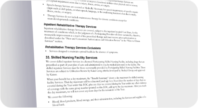 group number printed on this EOC add up to the visit maximum. After you reach the visit maximum, we will not cover any more visits for the remainder of the Year. This limitation does not apply to inpatient hospital Services, or to outpatient rehabilitative therapy Services to treat mental health conditions covered under this EOC. Outpatient Rehabilitative Therapy Services Limitations Physical therapy, massage therapy (soft tissue mobilization), and occupational therapy Services are covered as Medically Necessary to restore or improve functional abilities when physical and/or sensory perceptual impairment exists due to injury, illness, stroke, or surgery. Speech therapy Services are covered as Medically Necessary for speech impairments of specific organic origin such as cleft palate, or when speech, language, or the swallowing function is lost due to injury, illness, stroke, or surgery. Therapy Services do not include maintenance therapy for chronic conditions except for neurodevelopmental conditions. Inpatient Rehabilitative Therapy Services Inpatient rehabilitative therapy Services are covered, subject to the inpatient hospital Cost Share, for the treatment of conditions which, in the judgment of a Participating Provider will show sustainable, objective, measurable improvement as a result of the prescribed therapy and must receive prior authorization as described under the “Prior and Concurrent Authorization and Utilization Review” in the “How to Obtain Services” section. Rehabilitative Therapy Services Exclusions Services designed to maintain optimal health in the absence of symptoms. 33. Skilled Nursing Facility Services We cover skilled inpatient Services in a licensed Participating Skilled Nursing Facility, including drugs that are prescribed as part of your plan of care and administered to you by medical personnel in the facility. The skilled inpatient Services must be those customarily provided by Participating Skilled Nursing Facilities. These Services are subject to Utilization Review by Kaiser using criteria developed by Medical Group and approved by Kaiser. When your benefit has a day maximum, the “Benefit Summary” shows a day maximum for skilled nursing facility Services. That day maximum will be exhausted (used up) for a Year when the number of days that we covered during the Year under this EOC, plus any days we covered during the Year under any other evidence of coverage with the same group number printed on this EOC, add up to the day maximum. After you reach the day maximum, we will not cover any more days for the remainder of the Year. We cover the following: Blood, blood products, blood storage, and their administration, including the Services and supplies of a blood bank. Dialysis Services. Medical and biological supplies. Medical social Services. Nursing Services. Rehabilitative therapy Services. Room and board. EWCLGDED1983ACT0124 66 WAPEBB-CL-ACT