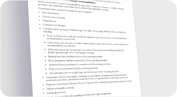 www.uspreventiveservicestaskforce.org/uspstf/recommendation-topics/uspstf-a-and-b- recommendations. Immunizations recommended by the Advisory Committee on Immunization Practices of the CDC. Preventive care and screenings for infants, children, and adolescents supported by the Health Resources and Services Administration (HRSA). Preventive care and screenings for women supported by HRSA. You can access the list of women’s preventive care Services at www.hrsa.gov/womensguidelines/. Services received for a current or ongoing illness, injury, sign or symptom of a disease, or condition during a preventive care examination or procedure may be subject to the applicable Cost Share. Covered preventive care Services include, but are not limited to: Bone densitometry. Cervical cancer screening. Chlamydia test. Cholesterol test (all types). Colorectal cancer screening for Members age 45 or older, or for younger Members who are at high risk, including: • Fecal occult blood test yearly plus one flexible sigmoidoscopy every four years, or more frequently as recommended by your provider. • Colonoscopy every ten years, or double contrast barium enema every five years, or more frequently as recommended by your provider. • Follow-up colonoscopy for screening to be achieved following abnormal findings identified by flexible sigmoidoscopy or CT colonography screening. • Required specialist consultation prior to the screening procedure. • Bowel preparation medications prescribed for the screening procedure. • Anesthesia Services performed in connection with the screening procedure. • Polyp removal performed during the screening procedure. • Any pathology exam on a polyp biopsy performed as part of the screening procedure. Contraceptive Services and supplies, including, but not limited to, transabdominal and transcervical sterilization procedures, and insertion/removal of IUD, or implanted birth control drugs and devices. Depression screening for Members 12 years of age and older, including pregnant and postpartum women. Diabetic retinopathy screening. Fasting glucose tests. Healthy diet counseling and counseling for obesity and weight management. Immunizations. Mammography, including tomosynthesis (3-D mammography). Pre-exposure prophylaxis (PrEP) therapies for Members who are at high risk for HIV infection. Prostate screening examinations once every two years for men 50 years of age or older or for younger Members who are at high risk, and more frequently if your provider recommends it because you are at high risk for prostate cancer or disease. EWCLGDED1983ACT0124 64 WAPEBB-CL-ACT