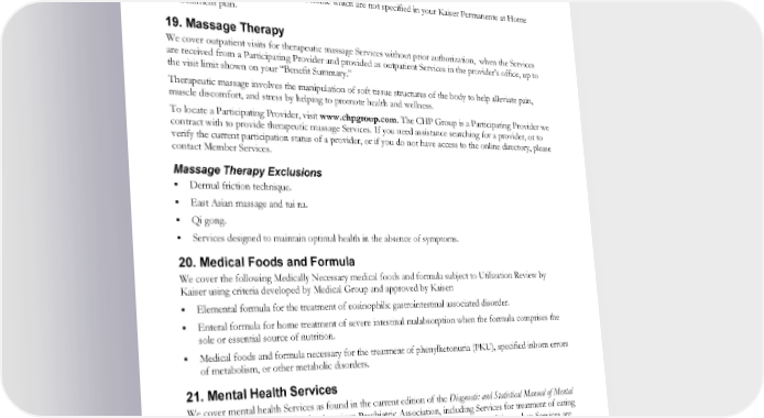 For outpatient prescription drug coverage and Cost Share information, please refer to the “Prescription Drugs, Insulin, and Diabetic Supplies” section in the EOC and “Benefit Summary”. Kaiser Permanente at Home Exclusions Housekeeping or meal services that are not part of your Kaiser Permanente at Home treatment plan. Any care provided by or for a family member. Any other Services rendered in the home which are not specified in your Kaiser Permanente at Home treatment plan. 19. Massage Therapy We cover outpatient visits for therapeutic massage Services without prior authorization, when the Services are received from a Participating Provider and provided as outpatient Services in the provider’s office, up to the visit limit shown on your “Benefit Summary.” Therapeutic massage involves the manipulation of soft tissue structures of the body to help alleviate pain, muscle discomfort, and stress by helping to promote health and wellness. To locate a Participating Provider, visit www.chpgroup.com. The CHP Group is a Participating Provider we contract with to provide therapeutic massage Services. If you need assistance searching for a provider, or to verify the current participation status of a provider, or if you do not have access to the online directory, please contact Member Services. Massage Therapy Exclusions Dermal friction technique. East Asian massage and tui na. Qi gong. Services designed to maintain optimal health in the absence of symptoms. 20. Medical Foods and Formula We cover the following Medically Necessary medical foods and formula subject to Utilization Review by Kaiser using criteria developed by Medical Group and approved by Kaiser: Elemental formula for the treatment of eosinophilic gastrointestinal associated disorder. Enteral formula for home treatment of severe intestinal malabsorption when the formula comprises the sole or essential source of nutrition. Medical foods and formula necessary for the treatment of phenylketonuria (PKU), specified inborn errors of metabolism, or other metabolic disorders. 21. Mental Health Services We cover mental health Services as found in the current edition of the Diagnostic and Statistical Manual of Mental Disorders (DSM), published by the American Psychiatric Association, including Services for treatment of eating disorders when associated with a diagnosis of a DSM categorized mental health condition, when Services are necessary for: Crisis intervention. Evaluation. Treatment of mental disorders or chronic conditions that a mental health Participating Provider determines to be Medically Necessary and expects to result in objective, measurable improvement. EWCLGDED1983ACT0124 52 WAPEBB-CL-ACT