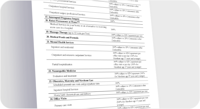 COVERED SERVICE BENEFIT 15. Hospice Services (including respite care) Hospice Services (respite care is limited to no more than five 100% consecutive days in a three-month period of hospice care) 16. Hospital Services Inpatient hospital Services 100% subject to 15% Coinsurance after Deductible Inpatient professional Services 100% subject to 15% Coinsurance after Deductible Outpatient hospital Services 100% subject to 15% Coinsurance after Deductible Outpatient surgery professional Services 100% subject to 15% Coinsurance after Deductible 17. Interrupted Pregnancy Surgery 100% 18. Kaiser Permanente at Home⢠Medical Services in your home as an alternative to receiving 100% acute care in a hospital 19. Massage Therapy (up to 12 visits per Year) 100% subject to $25 Copayment per visit 20. Medical Foods and Formula 100% subject to 20% Coinsurance after Deductible 21. Mental Health Services Inpatient and residential 100% subject to 15% Coinsurance after Deductible 100% subject to $25 Copayment per Outpatient and intensive outpatient Services office visit or per day (100% for Members age 17 years and younger) 100% subject to $25 Copayment per Partial hospitalization office visit or per day (100% for Members age 17 years and younger) 22. Naturopathic Medicine Evaluation and treatment 100% subject to $25 Copayment (100% for Members age 17 years and younger) 23. Obstetrics, Maternity and Newborn Care Scheduled prenatal care visits and postpartum visits 100% Inpatient hospital Services 100% subject to 15% Coinsurance after Deductible Home birth obstetrical care and delivery 100% subject to $35 Copayment per visit 24. Office Visits 100% subject to $25 Copayment per visit Primary care visits (100% for Members age 17 years and younger) Specialty care visits 100% subject to $35 Copayment per visit Urgent Care visits 100% subject to $45 Copayment per visit Nurse treatment room visits to receive injections 100% subject to $10 Copayment per visit 25. Organ Transplants Inpatient facility Services 100% subject to 15% Coinsurance after Deductible EWCLGDED1983ACT0124 3 WAPEBB-CL-ACT