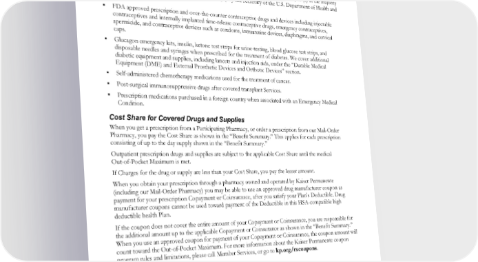 Drugs, injectables, and radioactive materials used for therapeutic or diagnostic purposes, if they are administered to you in a Participating Medical Office or during home visits. We cover these items upon payment of the Administered Medications Cost Share shown in the “Benefit Summary.” Drugs prescribed for an indication if the FDA has not approved the drug for that indication (off-label drugs) are covered only if our Regional Formulary and Therapeutics Committee determines that the drug is recognized as effective for that use (i) in one of the standard reference compendia, or (ii) in the majority of relevant peer-reviewed medical literature, or (iii) by the Secretary of the U.S. Department of Health and Human Services. FDA approved prescription and over-the-counter contraceptive drugs and devices including injectable contraceptives and internally implanted time-release contraceptive drugs, emergency contraceptives, spermicide, and contraceptive devices such as condoms, intrauterine devices, diaphragms, and cervical caps. Glucagon emergency kits, insulin, ketone test strips for urine-testing, blood glucose test strips, and disposable needles and syringes when prescribed for the treatment of diabetes. We cover additional diabetic equipment and supplies, including lancets and injection aids, under the “Durable Medical Equipment (DME) and External Prosthetic Devices and Orthotic Devices” section. Self-administered chemotherapy medications used for the treatment of cancer. Post-surgical immunosuppressive drugs after covered transplant Services. Prescription medications purchased in a foreign country when associated with an Emergency Medical Condition. Cost Share for Covered Drugs and Supplies When you get a prescription from a Participating Pharmacy, or order a prescription from our Mail-Order Pharmacy, you pay the Cost Share as shown in the “Benefit Summary.” This applies for each prescription consisting of up to the day supply shown in the “Benefit Summary.” Outpatient prescription drugs and supplies are subject to the applicable Cost Share until the medical Out-of-Pocket Maximum is met. If Charges for the drug or supply are less than your Cost Share, you pay the lesser amount. When you obtain your prescription through a pharmacy owned and operated by Kaiser Permanente (including our Mail-Order Pharmacy) you may be able to use an approved drug manufacturer coupon as payment for your prescription Copayment or Coinsurance, after you satisfy your Plan’s Deductible. Drug manufacturer coupons cannot be used toward payment of the Deductible in this HSA-compatible high deductible health Plan. If the coupon does not cover the entire amount of your Copayment or Coinsurance, you are responsible for the additional amount up to the applicable Copayment or Coinsurance as shown in the “Benefit Summary.” When you use an approved coupon for payment of your Copayment or Coinsurance, the coupon amount will count toward the Out-of-Pocket Maximum. For more information about the Kaiser Permanente coupon program rules and limitations, please call Member Services, or go to kp.org/rxcoupons. Day Supply Limit The prescribing provider determines how much of a drug or supply to prescribe. For purposes of day supply coverage limits, the prescribing provider determines the amount of a drug or supply that constitutes a Medically Necessary 30-day (or any other number of days) supply for you. When you pay the Cost Share shown in the “Benefit Summary,” you will receive the prescribed supply up to the day supply limit. If you wish to receive more than the covered day supply limit, then you must pay for any prescribed quantity that EWCLGDED1983ACT0124 58 WAPEBB-CL-ACT