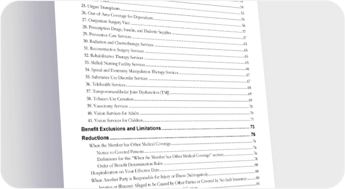 18. Kaiser Permanente at Home™ ......................................................................................................................... 50 19. Massage Therapy ................................................................................................................................................. 52 20. Medical Foods and Formula ............................................................................................................................. 52 21. Mental Health Services ....................................................................................................................................... 52 22. Naturopathic Medicine ...................................................................................................................................... 54 23. Obstetrics, Maternity and Newborn Care ....................................................................................................... 54 24. Office Visits ......................................................................................................................................................... 55 25. Organ Transplants .............................................................................................................................................. 55 26. Out-of-Area Coverage for Dependents........................................................................................................... 56 27. Outpatient Surgery Visit .................................................................................................................................... 57 28. Prescription Drugs, Insulin, and Diabetic Supplies ....................................................................................... 57 29. Preventive Care Services .................................................................................................................................... 63 30. Radiation and Chemotherapy Services ............................................................................................................ 65 31. Reconstructive Surgery Services ....................................................................................................................... 65 32. Rehabilitative Therapy Services ........................................................................................................................ 65 33. Skilled Nursing Facility Services ....................................................................................................................... 66 34. Spinal and Extremity Manipulation Therapy Services ................................................................................... 67 35. Substance Use Disorder Services ..................................................................................................................... 67 36. Telehealth Services.............................................................................................................................................. 68 37. Temporomandibular Joint Dysfunction (TMJ) .............................................................................................. 69 38. Tobacco Use Cessation ...................................................................................................................................... 69 39. Vasectomy Services ............................................................................................................................................ 70 40. Vision Services for Adults ................................................................................................................................. 70 41. Vision Services for Children .............................................................................................................................. 71 Benefit Exclusions and Limitations............................................................................. 73 Reductions ..................................................................................................................... 76 When the Member has Other Medical Coverage ................................................................................................. 76 Notice to Covered Persons ............................................................................................................................... 76 Definitions for this “When the Member has Other Medical Coverage” section: ..................................... 76 Order of Benefit Determination Rules ........................................................................................................... 78 Hospitalization on Your Effective Date ................................................................................................................ 80 When Another Party is Responsible for Injury or Illness (Subrogation) .......................................................... 80 Injuries or Illnesses Alleged to be Caused by Other Parties or Covered by No-fault Insurance ........... 80 Surrogacy Arrangements – Traditional and Gestational Carriers ...................................................................... 81 Workers’ Compensation or Employer’s Liability ................................................................................................. 82 Grievances, Claims, Appeals, and External Review .................................................. 83 Language and Translation Assistance ..................................................................................................................... 84 Sharing Additional Information That We Collect ................................................................................................ 85 Internal Claims and Appeals Procedures ............................................................................................................... 85 EWCLGDED1983ACT0124 WAPEBB-CL-ACT