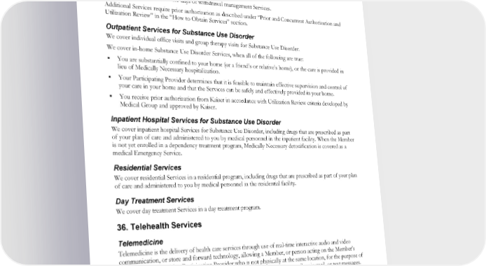 You do not need to obtain prior authorization for the following Substance Use Disorder Services: Emergency detoxification for medical conditions associated with acute alcohol, drug, or other substance abuse. Substance Use Disorder treatment Services provided in a behavioral health agency licensed or certified in the state of Washington, limited to: • The first two business days of inpatient or residential Services. • The first three business days of withdrawal management Services. Additional Services require prior authorization as described under “Prior and Concurrent Authorization and Utilization Review” in the “How to Obtain Services” section. Outpatient Services for Substance Use Disorder We cover individual office visits and group therapy visits for Substance Use Disorder. We cover in-home Substance Use Disorder Services, when all of the following are true: You are substantially confined to your home (or a friend’s or relative’s home), or the care is provided in lieu of Medically Necessary hospitalization. Your Participating Provider determines that it is feasible to maintain effective supervision and control of your care in your home and that the Services can be safely and effectively provided in your home. You receive prior authorization from Kaiser in accordance with Utilization Review criteria developed by Medical Group and approved by Kaiser. Inpatient Hospital Services for Substance Use Disorder We cover inpatient hospital Services for Substance Use Disorder, including drugs that are prescribed as part of your plan of care and administered to you by medical personnel in the inpatient facility. When the Member is not yet enrolled in a dependency treatment program, Medically Necessary detoxification is covered as a medical Emergency Service. Residential Services We cover residential Services in a residential program, including drugs that are prescribed as part of your plan of care and administered to you by medical personnel in the residential facility. Day Treatment Services We cover day treatment Services in a day treatment program. 36. Telehealth Services Telemedicine Telemedicine is the delivery of health care services through use of real-time interactive audio and video communication, or store and forward technology, allowing a Member, or person acting on the Member’s behalf, to interact with a Participating Provider who is not physically at the same location, for the purpose of diagnosis, consultation, or treatment. Telemedicine does not include fax, email, voicemail, or text messages. Store and forward technology means sending a Member’s medical information from an originating site to the health care provider at a distant site for later review. The provider follows up with a medical diagnosis for the Member and helps manage their care. Store and forward technology does not include use of audio-only telephone, fax, or email. EWCLGDED1983ACT0124 68 WAPEBB-CL-ACT