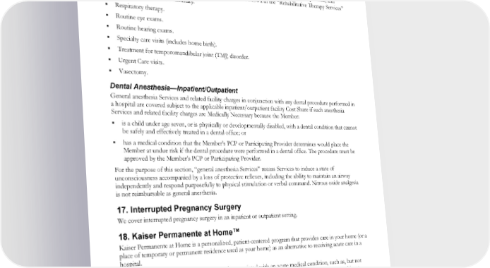 Nurse treatment room visits to receive injections, including allergy injections. Outpatient surgery and other outpatient procedures, including interrupted pregnancy surgery performed in an outpatient setting. Primary care visits for internal medicine, gynecology, family medicine, and pediatrics. Rehabilitative therapy Services such as massage (soft tissue mobilization), physical, occupational, and speech therapy Services, subject to the benefit limitations shown in the “Rehabilitative Therapy Services” section of the “Benefit Summary.” Respiratory therapy. Routine eye exams. Routine hearing exams. Specialty care visits (includes home birth). Treatment for temporomandibular joint (TMJ) disorder. Urgent Care visits. Vasectomy. Dental Anesthesia—Inpatient/Outpatient General anesthesia Services and related facility charges in conjunction with any dental procedure performed in a hospital are covered subject to the applicable inpatient/outpatient facility Cost Share if such anesthesia Services and related facility charges are Medically Necessary because the Member: is a child under age seven, or is physically or developmentally disabled, with a dental condition that cannot be safely and effectively treated in a dental office; or has a medical condition that the Member’s PCP or Participating Provider determines would place the Member at undue risk if the dental procedure were performed in a dental office. The procedure must be approved by the Member’s PCP or Participating Provider. For the purpose of this section, “general anesthesia Services” means Services to induce a state of unconsciousness accompanied by a loss of protective reflexes, including the ability to maintain an airway independently and respond purposefully to physical stimulation or verbal command. Nitrous oxide analgesia is not reimbursable as general anesthesia. 17. Interrupted Pregnancy Surgery We cover interrupted pregnancy surgery in an inpatient or outpatient setting. 18. Kaiser Permanente at Home™ Kaiser Permanente at Home is a personalized, patient-centered program that provides care in your home (or a place of temporary or permanent residence used as your home) as an alternative to receiving acute care in a hospital. Kaiser Permanente at Home Services must be associated with an acute medical condition, such as, but not limited to, congestive heart failure, pneumonia, cellulitis or upper urinary tract infection, and are subject to prior authorization from Company in accordance with Utilization Review criteria developed by Medical Group and approved by Company. To receive Kaiser Permanente at Home Services: You must be referred into the program by a Participating Provider. Your condition must meet criteria for Medically Necessary hospitalization. EWCLGDED1983ACT0124 50 WAPEBB-CL-ACT