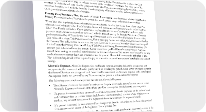 health coverage, as defined by state law; school accident type coverage; benefits for non-medical components of long-term care policies; automobile insurance policies required by statute to provide medical benefits; Medicare supplement policies; Medicaid coverage; or coverage under other federal governmental Plans, unless permitted by law. Each contract for coverage is a separate Plan. If a Plan has two parts and COB rules apply only to one of the two, each of the parts is treated as a separate Plan. This Plan. This Plan means the part of the contract providing the health care benefits to which the COB provision applies, and which may be reduced because of the benefits of other Plans. Any other part of the contract providing health care benefits is separate from This Plan. A contract may apply one COB provision to certain benefits, such as dental benefits, coordinating only with similar benefits, and may apply another COB provision to coordinate other benefits. Primary Plan/Secondary Plan. The order of benefit determination rules determines whether This Plan is a Primary Plan or Secondary Plan when the person has health care coverage under more than one Plan. When This Plan is primary, Kaiser determines payment for the benefits first before those of any other Plan without considering any other Plan's benefits. Kaiser will not reduce the Member’s benefits under This Plan. When This Plan is secondary, Kaiser determines the benefits after those of another Plan and must make payment in an amount so that when combined with the amount paid by the Primary Plan, the total benefits paid or provided by all Plans for the claim equal 100 percent of the total Allowable Expense for that claim. This means that when This Plan is secondary, Kaiser must pay the amount which, when combined with what the Primary Plan paid, cannot be less than the same Allowable Expense the Secondary Plan would have paid if it had been the Primary Plan. In addition, if This Plan is secondary, Kaiser must calculate the savings (the amount paid subtracted from the amount Kaiser would have paid had Kaiser been the Primary Plan) and record these savings as a medical benefit reserve for the covered person. This reserve must be used to pay any medical expenses during that Year, whether or not they are an Allowable Expense under This Plan. If This Plan is Secondary, it will not be required to pay an amount in excess of its maximum benefit plus any accrued savings. Allowable Expense. Allowable Expense is a health care expense, including deductible, coinsurance, and copayments, that is covered at least in part by any Plan covering the person. When a Plan provides benefits in the form of Services, the charges of each Service will be considered an Allowable Expense and a benefit paid. An expense that is not covered by any Plan covering the person is not an Allowable Expense. The following are examples of expenses that are not Allowable Expenses: The difference between the cost of a semi-private hospital room and a private hospital room is not an Allowable Expense unless one of the Plans provides coverage for private hospital room expenses. If a person is covered by two or more Plans that compute their benefit payments on the basis of usual and customary fees or relative value schedule reimbursement method or other similar reimbursement method, any amount in excess of the highest reimbursement amount for a specific benefit. If a person is covered by two or more Plans that provide benefits or Services on the basis of negotiated fees, an amount in excess of the highest of the negotiated fees. Closed Panel Plan. Closed Panel Plan is a Plan that provides health care benefits to covered persons in the form of Services through a panel of providers who are primarily contracted by the Plan, and that excludes coverage for Services provided by other providers, except in cases of emergency or referral by a panel provider. Custodial Parent. Custodial parent is the parent awarded custody by a court decree or, in the absence of a court decree, is the parent with whom the child resides more than one-half of the Year excluding any temporary visitation. EWCLGDED1983ACT0124 77 WAPEBB-CL-ACT