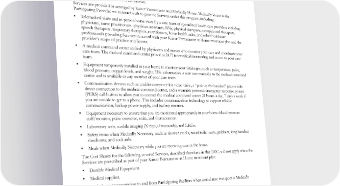 A Medical Group physician determines that it is feasible to maintain effective supervision and control of your care in the home, and that based on your health status, treatment plan, and home setting, you can be treated safely and effectively in the home. You must consent to receiving Kaiser Permanente at Home Services because you prefer to receive the care described in your treatment plan in your home. The care location must be within 30 minutes of a 911 response. The care location must have cell service. Services are provided or arranged by Kaiser Permanente and Medically Home. Medically Home is the Participating Provider we contract with to provide Services under this program, including: Telemedical visits and in-person home visits by a care team of specialized health care providers including physicians, nurse practitioners, physician assistants, RNs, physical therapists, occupational therapists, speech therapists, respiratory therapists, nutritionists, home health aides, and other healthcare professionals providing Services in accord with your Kaiser Permanente at Home treatment plan and the provider’s scope of practice and license. A medical command center staffed by physicians and nurses who monitor your care and coordinate your care team. The medical command center provides 24/7 telemedical monitoring and access to your care team. Equipment temporarily installed in your home to monitor your vital signs, such as temperature, pulse, blood pressure, oxygen levels, and weight. This information is sent automatically to the medical command center and is available to any member of your care team. Communication devices such as a tablet computer for video visits, a “pick up the handset” phone with direct connection to the medical command center, and a wearable personal emergency response system (PERS) call button to allow you to contact the medical command center 24 hours a day, 7 days a week if you are unable to get to a phone. This includes communication technology to support reliable communication, backup power supply, and backup internet. Equipment necessary to ensure that you are monitored appropriately in your home: blood pressure cuff/monitor, pulse oximeter, scale, and thermometer. Laboratory tests, mobile imaging (X-rays, ultrasounds), and EKGs. Safety items when Medically Necessary, such as shower stools, raised toilet seats, grabbers, long handled shoehorns, and sock aids. Meals when Medically Necessary while you are receiving care in the home. The Cost Shares for the following covered Services, described elsewhere in this EOC, will not apply when the Services are prescribed as part of your Kaiser Permanente at Home treatment plan: Durable Medical Equipment. Medical supplies. Ambulance transportation to and from Participating Facilities when ambulance transport is Medically Necessary. Physician assistant and nurse practitioner house calls. Emergency Department visits associated with this benefit. The Cost Shares for covered Services described elsewhere in this EOC will apply to any Services that are not part of your Kaiser Permanente at Home treatment plan (for example, DME not specified in your Kaiser Permanente at Home treatment plan). EWCLGDED1983ACT0124 51 WAPEBB-CL-ACT