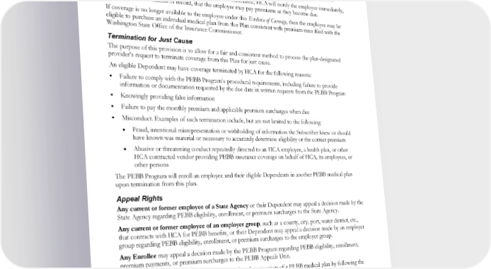 General provisions for eligibility and enrollment Payment of Premiums During a Labor Dispute Any employee or Dependent whose monthly premiums are paid in full or in part by the Employing Agency may pay premiums directly to HCA if the employee’s compensation is suspended or terminated directly or indirectly because of a strike, lockout, or any other labor dispute, for a period not to exceed six months. When the employee’s compensation is suspended or terminated, HCA will notify the employee immediately, by mail at the last address of record, that the employee may pay premiums as they become due. If coverage is no longer available to the employee under this Evidence of Coverage, then the employee may be eligible to purchase an individual medical plan from this Plan consistent with premium rates filed with the Washington State Office of the Insurance Commissioner. Termination for Just Cause The purpose of this provision is to allow for a fair and consistent method to process the plan-designated provider’s request to terminate coverage from this Plan for just cause. An eligible Dependent may have coverage terminated by HCA for the following reasons: Failure to comply with the PEBB Program’s procedural requirements, including failure to provide information or documentation requested by the due date in written requests from the PEBB Program Knowingly providing false information Failure to pay the monthly premium and applicable premium surcharges when due Misconduct. Examples of such termination include, but are not limited to the following: • Fraud, intentional misrepresentation or withholding of information the Subscriber knew or should have known was material or necessary to accurately determine eligibility or the correct premium • Abusive or threatening conduct repeatedly directed to an HCA employee, a health plan, or other HCA contracted vendor providing PEBB insurance coverage on behalf of HCA, its employees, or other persons The PEBB Program will enroll an employee and their eligible Dependents in another PEBB medical plan upon termination from this plan. Appeal Rights Any current or former employee of a State Agency or their Dependent may appeal a decision made by the State Agency regarding PEBB eligibility, enrollment, or premium surcharges to the State Agency. Any current or former employee of an employer group, such as a county, city, port, water district, etc., that contracts with HCA for PEBB benefits, or their Dependent may appeal a decision made by an employer group regarding PEBB eligibility, enrollment, or premium surcharges to the employer group. Any Enrollee may appeal a decision made by the PEBB Program regarding PEBB eligibility, enrollment, premium payments, or premium surcharges to the PEBB Appeals Unit. Any Enrollee may appeal a decision regarding the administration of a PEBB medical plan by following the appeal provisions of the Plan, except when regarding eligibility, enrollment, and premium payment decisions. Learn more at hca.wa.gov/pebb-appeals. Relationship to Law and Regulations Any provision of this Evidence of Coverage that is in conflict with any governing law or regulation of Washington State is hereby amended to comply with the minimum requirements of such law or regulation. EWCLGDED1983ACT0124 29 WAPEBB-CL-ACT