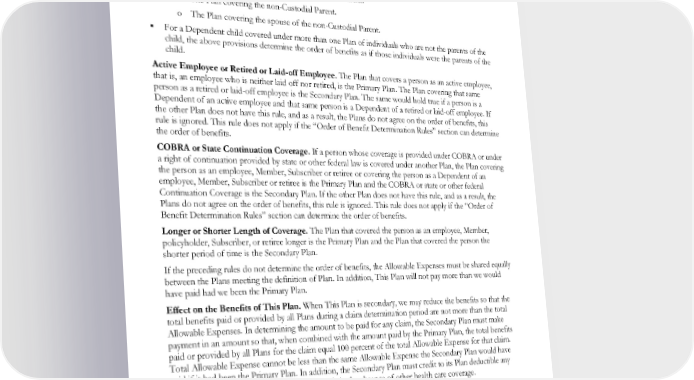the parent whose birthday falls earlier in the Year is the Primary Plan or if both parents have the same birthday, the Plan that has covered the parent the longest is the Primary Plan; or • If there is no court decree allocating responsibility for the Dependent child's health care expenses or health care coverage, the order of benefits for the child are as follows: o The Plan covering the Custodial Parent. o The Plan covering the spouse of the Custodial Parent. o The Plan covering the non-Custodial Parent. o The Plan covering the spouse of the non-Custodial Parent. For a Dependent child covered under more than one Plan of individuals who are not the parents of the child, the above provisions determine the order of benefits as if those individuals were the parents of the child. Active Employee or Retired or Laid-off Employee. The Plan that covers a person as an active employee, that is, an employee who is neither laid off nor retired, is the Primary Plan. The Plan covering that same person as a retired or laid-off employee is the Secondary Plan. The same would hold true if a person is a Dependent of an active employee and that same person is a Dependent of a retired or laid-off employee. If the other Plan does not have this rule, and as a result, the Plans do not agree on the order of benefits, this rule is ignored. This rule does not apply if the “Order of Benefit Determination Rules” section can determine the order of benefits. COBRA or State Continuation Coverage. If a person whose coverage is provided under COBRA or under a right of continuation provided by state or other federal law is covered under another Plan, the Plan covering the person as an employee, Member, Subscriber or retiree or covering the person as a Dependent of an employee, Member, Subscriber or retiree is the Primary Plan and the COBRA or state or other federal Continuation Coverage is the Secondary Plan. If the other Plan does not have this rule, and as a result, the Plans do not agree on the order of benefits, this rule is ignored. This rule does not apply if the “Order of Benefit Determination Rules” section can determine the order of benefits. Longer or Shorter Length of Coverage. The Plan that covered the person as an employee, Member, policyholder, Subscriber, or retiree longer is the Primary Plan and the Plan that covered the person the shorter period of time is the Secondary Plan. If the preceding rules do not determine the order of benefits, the Allowable Expenses must be shared equally between the Plans meeting the definition of Plan. In addition, This Plan will not pay more than we would have paid had we been the Primary Plan. Effect on the Benefits of This Plan. When This Plan is secondary, we may reduce the benefits so that the total benefits paid or provided by all Plans during a claim determination period are not more than the total Allowable Expenses. In determining the amount to be paid for any claim, the Secondary Plan must make payment in an amount so that, when combined with the amount paid by the Primary Plan, the total benefits paid or provided by all Plans for the claim equal 100 percent of the total Allowable Expense for that claim. Total Allowable Expense cannot be less than the same Allowable Expense the Secondary Plan would have paid if it had been the Primary Plan. In addition, the Secondary Plan must credit to its Plan deductible any amounts it would have credited to its deductible in the absence of other health care coverage. Right to Receive and Release Needed Information. Certain facts about health care coverage and Services are needed to apply these COB rules and to determine benefits payable under This Plan and other Plans. Kaiser may get the facts needed from or give them to other organizations or persons for the purpose of applying these rules and determining benefits payable under This Plan and other Plans covering the person claiming benefits. Kaiser is not required to tell, or obtain the consent of, any person to do this. Each person EWCLGDED1983ACT0124 79 WAPEBB-CL-ACT