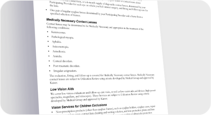 Eyeglasses and Contact Lenses after Cataract Surgery If you have cataract surgery and since that surgery we have never covered eyeglasses or contact lenses under any benefit for eyeglasses and contact lenses after cataract surgery (including any eyeglasses or contact lenses we covered under any other coverage), we cover your choice of one of the following, without charge, if obtained from a Participating Vendor. We will cover both of the following if, in the judgment of a Participating Provider, you must wear eyeglass lenses and contact lenses at the same time to provide a significant improvement in vision not obtainable with regular eyeglass lenses or contact lenses alone: One conventional contact lens, or a 6-month supply of disposable contact lenses, determined by your Participating Provider for each eye on which you had cataract surgery, and fitting and follow-up care for the lens. One pair of regular eyeglass lenses determined by your Participating Provider and a frame from a specified selection of frames. Medically Necessary Contact Lenses Contact lenses may be determined to be Medically Necessary and appropriate in the treatment of the following conditions: Keratoconus. Pathological myopia. Aphakia. Anisometropia. Aniseikonia. Aniridia. Corneal disorders. Post-traumatic disorders. Irregular astigmatism. The evaluation, fitting, and follow-up is covered for Medically Necessary contact lenses. Medically Necessary contact lenses are subject to Utilization Review using criteria developed by Medical Group and approved by Kaiser. Low Vision Aids We cover low vision evaluations and follow-up care visits, as well as low vision aids and devices (high-power spectacles, magnifiers, and telescopes). These Services are subject to Utilization Review using criteria developed by Medical Group and approved by Kaiser. Vision Services for Children Exclusions Non-prescription products (other than eyeglass frames), such as eyeglass holders, eyeglass cases, repair kits, contact lens cases, contact lens cleaning and wetting solution, and lens protection plans; and lens add-on features such as lens coatings (other than scratch resistant coating or ultraviolet protection coating). No-line or progressive bifocal and trifocal lenses. Non-prescription sunglasses. Optometric vision therapy and orthoptic (eye exercises). Plano contact lenses or glasses (non-prescription). EWCLGDED1983ACT0124 72 WAPEBB-CL-ACT