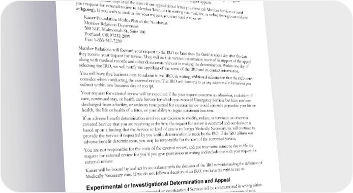 External review is permitted to occur simultaneously with your urgent pre-Service appeal or urgent concurrent care appeal; Your request qualifies for expedited external review; We have failed to comply with federal requirements regarding our claims and appeals procedures; or We have failed to comply with the Washington requirement to make a decision regarding the appeal within 30 calendar days for non-urgent appeals and 72 hours for urgent appeals. Within 180 calendar days after the date of our appeal denial letter you must call Member Services or send your request for external review to Member Relations in writing (via mail, fax, or online through our website at kp.org). If you wish to mail or fax your request, you may send it to us at: Kaiser Foundation Health Plan of the Northwest Member Relations Department 500 N.E. Multnomah St., Suite 100 Portland, OR 97232-2099 Fax: 1-855-347-7239 Member Relations will forward your request to the IRO no later than the third business day after the date they receive your request for review. They will include written information received in support of the appeal along with medical records and other documents relevant in making the determination. Within one day of selecting the IRO, we will notify the appellant of the name of the IRO and its contact information. You will have five business days to submit to the IRO, in writing, additional information that the IRO must consider when conducting the external review. The IRO will forward to us any additional information you submit within one business day of receipt. Your request for external review will be expedited if the your request concerns an admission, availability of care, continued stay, or health care Service for which you received Emergency Services but have not been discharged from a facility, or ordinary time period for external review would seriously jeopardize your life or health, the life or health of a fetus, or your ability to regain maximum function. If an adverse benefit determination involves our decision to modify, reduce, or terminate an otherwise covered Service that you are receiving at the time the request for review is submitted and our decision is based upon a finding that the Service or level of care is no longer Medically Necessary, we will continue to provide the Service if requested by you until a determination is made by the IRO. If the IRO affirms our adverse benefit determination, you may be responsible for the cost of the continued Service. You are not responsible for the costs of the external review, and you may name someone else to file the request for external review for you if you give permission in writing and include that with your request for external review. Kaiser will be bound by and act in accordance with the decision of the IRO notwithstanding the definition of Medically Necessary care. If we do not follow a decision of an IRO, you have the right to sue us. Experimental or Investigational Determination and Appeal Decisions on appeals about experimental or investigational Services will be communicated in writing within 20 days of receipt of a fully documented request, unless you consent in writing to an extension of time. Appeals that meet the criteria for an urgent appeal, as described in the “Urgent Pre-Service Appeal” section, will be expedited to meet the clinical urgency of the situation, not to exceed 72 hours. If, on appeal, the decision to deny Services is upheld, the final decision will specify (i) the title, specialty, and professional qualifications of the individual(s) who made the final decision and (ii) the basis for the final decision. EWCLGDED1983ACT0124 92 WAPEBB-CL-ACT
