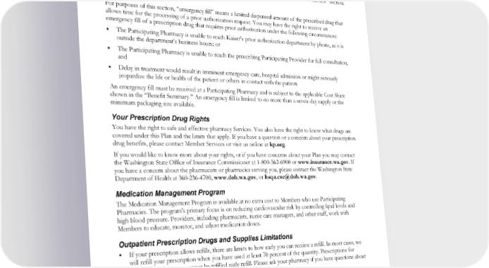 If we approve an exception through this exception process, then we will cover the drug or supply at the applicable Cost Share shown in the “Prescription drugs, insulin, and diabetic supplies” section in the Benefit Summary. If we do not approve the Formulary exception request, we will send you a letter informing you of that decision. You may request a review by an independent review organization. The process is explained in our denial letter and under “External Review” in the “Grievances, Claims, Appeals, and External Review” section. Emergency Fill For purposes of this section, “emergency fill” means a limited dispensed amount of the prescribed drug that allows time for the processing of a prior authorization request. You may have the right to receive an emergency fill of a prescription drug that requires prior authorization under the following circumstances: The Participating Pharmacy is unable to reach Kaiser’s prior authorization department by phone, as it is outside the department’s business hours; or The Participating Pharmacy is unable to reach the prescribing Participating Provider for full consultation, and Delay in treatment would result in imminent emergency care, hospital admission or might seriously jeopardize the life or health of the patient or others in contact with the patient. An emergency fill must be received at a Participating Pharmacy and is subject to the applicable Cost Share shown in the “Benefit Summary.” An emergency fill is limited to no more than a seven-day supply or the minimum packaging size available. Your Prescription Drug Rights You have the right to safe and effective pharmacy Services. You also have the right to know what drugs are covered under this Plan and the limits that apply. If you have a question or a concern about your prescription drug benefits, please contact Member Services or visit us online at kp.org. If you would like to know more about your rights, or if you have concerns about your Plan you may contact the Washington State Office of Insurance Commissioner at 1-800-562-6900 or www.insurance.wa.gov. If you have a concern about the pharmacists or pharmacies serving you, please contact the Washington State Department of Health at 360-236-4700, www.doh.wa.gov, or [email protected]. Medication Management Program The Medication Management Program is available at no extra cost to Members who use Participating Pharmacies. The program’s primary focus is on reducing cardiovascular risk by controlling lipid levels and high blood pressure. Providers, including pharmacists, nurse care managers, and other staff, work with Members to educate, monitor, and adjust medication doses. Outpatient Prescription Drugs and Supplies Limitations If your prescription allows refills, there are limits to how early you can receive a refill. In most cases, we will refill your prescription when you have used at least 70 percent of the quantity. Prescriptions for controlled substances cannot be refilled early refill. Please ask your pharmacy if you have questions about when you can get a covered refill. The Participating Pharmacy may reduce the day supply dispensed at the applicable Cost Share to a 30-day supply in any 30-day period if it determines that the drug or supply is in limited supply in the market or for certain other items. Your Participating Pharmacy can tell you if a drug or supply you use is one of these items. For certain drugs or supplies we may limit the amount of a drug or supply that is covered for a specified time frame. Quantity limits are in place to ensure safe and appropriate use of a drug or supply. Drugs and EWCLGDED1983ACT0124 62 WAPEBB-CL-ACT