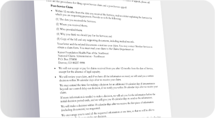 • If we deny your appeal, our adverse benefit determination decision will tell you why we denied your appeal and will include information about any further process, including external review, which may be available to you. Post-Service Claims and Appeals Post-Service claims are requests that we pay for Services you already received, including claims for out-of- Plan Emergency Services. If you have any general questions about post-Service claims or appeals, please call Member Services. Here are the procedures for filing a post-Service claim and a post-Service appeal: Post-Service Claim • Within 12 months from the date you received the Services, mail us a letter explaining the Services for which you are requesting payment. Provide us with the following: (1) The date you received the Services; (2) Where you received them; (3) Who provided them; (4) Why you think we should pay for the Services; and (5) Copy of the bill and any supporting documents, including medical records. Your letter and the related documents constitute your claim. You may contact Member Services to obtain a claim form. You must mail your claim to the Claims Department at: Kaiser Foundation Health Plan of the Northwest National Claims Administration - Northwest P.O. Box 370050 Denver, CO 80237-9998 • We will not accept or pay for claims received from you after 12 months from the date of Service, except for the absence of legal capacity. • We will review your claim, and if we have all the information we need, we will send you a written decision within 30 calendar days after we receive your claim. We may extend the time for making a decision for an additional 15 calendar days if circumstances beyond our control delay our decision, if we notify you within 30 calendar days after we receive your claim. If more information is needed to make a decision, we will ask you for the information before the initial decision period ends, and we will give you 45 calendar days to send us the information. We will make a decision within 15 calendar days after we receive the first piece of information (including documents) we requested. We encourage you to send all the requested information at one time, so that we will be able to consider it all when we make our decision. If we do not receive any of the requested information (including documents) within 45 calendar days after we send our request, we will make a decision based on the information we have within 15 calendar days following the end of the 45 calendar day period. • If we deny your claim (if we do not pay for all the Services you requested), our adverse benefit determination notice will tell you why we denied your claim and how you can appeal. EWCLGDED1983ACT0124 90 WAPEBB-CL-ACT