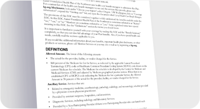 INTRODUCTION This Evidence of Coverage (EOC), including the “Benefit Summary,” describes the health care benefits of this Plan provided under the Administrative Services Contract (Contract) between Kaiser Foundation Health Plan of the Northwest and the Washington State Health Care Authority (HCA) for the Public Employees Benefits Board (PEBB) Program. In the event of a conflict in language between the Plan Contract and the EOC, the EOC will govern. For benefits provided under any other Plan, refer to that Plan’s evidence of coverage. The provider network for this Deductible Plan is the Classic network. Kaiser Foundation Health Plan of the Northwest uses health care benefit managers to administer this Plan. For a current list of the health care benefit managers we use and the services they provide, please visit kp.org/disclosures; look under “Choose your region”; select Oregon / SW Washington; click on “Coverage information”; expand the “Getting care” list; and open the document titled List of Health Care Benefit Managers. The provisions of this EOC must be considered together to fully understand the benefits available under the EOC. In this EOC, Kaiser Foundation Health Plan of the Northwest is sometimes referred to as “Kaiser,” “we,” “our,” or “us.” Members are sometimes referred to as “you.” Some capitalized terms have special meaning in this EOC. See the “Definitions” section for terms you should know. It is important to familiarize yourself with your coverage by reading this EOC and the “Benefit Summary” completely, so that you can take full advantage of your Plan benefits. Also, if you have special health care needs, carefully read the sections applicable to you. If you would like additional information about your benefits, important health plan disclosures, or other products or services, please call Member Services or you may also e-mail us by registering at kp.org. DEFINITIONS Allowed Amount. The lower of the following amounts: The actual fee the provider, facility, or vendor charged for the Service. 160 percent of the Medicare fee for the Service, as indicated by the applicable Current Procedural Terminology (CPT) code or Healthcare Common Procedure Coding System (HCPCS) code shown on the current Medicare fee schedule. The Medicare fee schedule is developed by the Centers for Medicare and Medicaid Services (CMS) and adjusted by Medicare geographical practice indexes. When there is no established CPT or HCPCS code indicating the Medicare fee for a particular Service, the Allowed Amount is 70 percent of the actual fee the provider, facility, or vendor charged for the Service. Ancillary Service. Services that are: Related to emergency medicine, anesthesiology, pathology, radiology, and neonatology, whether provided by a physician or non-physician practitioner. Provided by assistant surgeons, hospitalists, and intensivists. Diagnostic Services, including radiology and laboratory Services. Provided by a Non-Participating Provider if there is no Participating Provider who can furnish such Service at the facility. Provided as a result of unforeseen, urgent medical needs that arise at the time the Service is provided, regardless of whether the Non-Participating Provider or Non-Participating Facility satisfies the notice and consent requirements under federal law. Annual Open Enrollment. A period of time defined by HCA when a Subscriber may change to another health plan offered by the PEBB Program and make certain other account changes for an effective date beginning January 1 of the following year. EWCLGDED1983ACT0124 7 WAPEBB-CL-ACT
