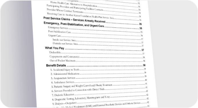 Primary Care Participating Providers ..................................................................................................................... 30 Women’s health Care Services ................................................................................................................................ 30 Referrals ...................................................................................................................................................................... 31 Referrals to Participating Providers and Participating Facilities .................................................................. 31 Referrals to Non-Participating Providers and Non-Participating Facilities ............................................... 32 Prior and Concurrent Authorization and Utilization Review ............................................................................. 32 Individual Case Management ............................................................................................................................ 33 Home Health Care Alternative to Hospitalization ........................................................................................ 33 Participating Providers and Participating Facilities Contracts ............................................................................ 34 Provider Whose Contract Terminates.................................................................................................................... 34 Receiving Care in Another Kaiser Foundation Health Plan Service Area ........................................................ 34 Post Service Claims – Services Already Received .................................................... 35 Emergency, Post-Stabilization, and Urgent Care ....................................................... 35 Emergency Services .................................................................................................................................................. 35 Post-Stabilization Care ............................................................................................................................................. 36 Urgent Care ................................................................................................................................................................ 37 Inside our Service Area ...................................................................................................................................... 37 Outside our Service Area .................................................................................................................................. 37 What You Pay ................................................................................................................ 37 Deductible .................................................................................................................................................................. 37 Copayments and Coinsurance ................................................................................................................................. 38 Out-of-Pocket Maximum ......................................................................................................................................... 38 Benefit Details ............................................................................................................... 38 1. Accidental Injury to Teeth ................................................................................................................................... 39 2. Administered Medications ................................................................................................................................... 39 3. Acupuncture Services ........................................................................................................................................... 39 4. Ambulance Services .............................................................................................................................................. 40 5. Bariatric Surgery and Weight Control and Obesity Treatment ...................................................................... 41 6. Services Provided in Connection with Clinical Trials ...................................................................................... 41 7. Diabetic Education ............................................................................................................................................... 42 8. Diagnostic Testing, Laboratory, Mammograms and X-ray ............................................................................ 42 9. Dialysis—Outpatient ............................................................................................................................................ 42 10. Durable Medical Equipment (DME) and External Prosthetic Devices and Orthotic Devices .............. 42 11. Emergency Services ............................................................................................................................................ 45 12. Habilitative Services ............................................................................................................................................ 45 13. Hearing Instruments ........................................................................................................................................... 46 14. Home Health Services ........................................................................................................................................ 47 15. Hospice Services ................................................................................................................................................. 47 16. Hospital Services ................................................................................................................................................. 48 EWCLGDED1983ACT0124 WAPEBB-CL-ACT