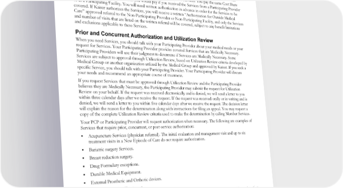 Referrals to Non-Participating Providers and Non-Participating Facilities If your PCP decides that you require Services not available from Participating Providers or Participating Facilities, they will recommend to Medical Group and Kaiser that you be referred to a Non-Participating Provider or Non-Participating Facility. If the Medical Group’s assigned Participating Provider determines that the Services are Medically Necessary and are not available from a Participating Provider or Participating Facility and determines that the Services are covered Services, Kaiser will authorize your referral to a Non- Participating Provider or Non-Participating Facility for the covered Services. You pay the same Cost Share for authorized referral Services that you would pay if you received the Services from a Participating Provider or at a Participating Facility. You will need written authorization in advance in order for the Services to be covered. If Kaiser authorizes the Services, you will receive a written “Authorization for Outside Medical Care” approved referral to the Non-Participating Provider or Non-Participating Facility, and only the Services and number of visits that are listed on the written referral will be covered, subject to any benefit limitations and exclusions applicable to these Services. Prior and Concurrent Authorization and Utilization Review When you need Services, you should talk with your Participating Provider about your medical needs or your request for Services. Your Participating Provider provides covered Services that are Medically Necessary. Participating Providers will use their judgment to determine if Services are Medically Necessary. Some Services are subject to approval through Utilization Review, based on Utilization Review criteria developed by Medical Group or another organization utilized by the Medical Group and approved by Kaiser. If you seek a specific Service, you should talk with your Participating Provider. Your Participating Provider will discuss your needs and recommend an appropriate course of treatment. If you request Services that must be approved through Utilization Review and the Participating Provider believes they are Medically Necessary, the Participating Provider may submit the request for Utilization Review on your behalf. If the request was received electronically and is denied, we will send a letter to you within three calendar days after we receive the request. If the request was received orally or in writing and is denied, we will send a letter to you within five calendar days after we receive the request. The decision letter will explain the reason for the determination along with instructions for filing an appeal. You may request a copy of the complete Utilization Review criteria used to make the determination by calling Member Services. Your PCP or Participating Provider will request authorization when necessary. The following are examples of Services that require prior, concurrent, or post-service authorization: Acupuncture Services (physician referred). The initial evaluation and management visit and up to six treatment visits in a New Episode of Care do not require authorization. Bariatric surgery Services. Breast reduction surgery. Drug Formulary exceptions. Durable Medical Equipment. External Prosthetic and Orthotic devices. Gender Affirming Treatment. General anesthesia and associated hospital or ambulatory surgical facility Services provided in conjunction with non-covered dental Services. Habilitative Services. Hospice and home health Services. Inpatient hospital Services, including birthing centers. EWCLGDED1983ACT0124 32 WAPEBB-CL-ACT