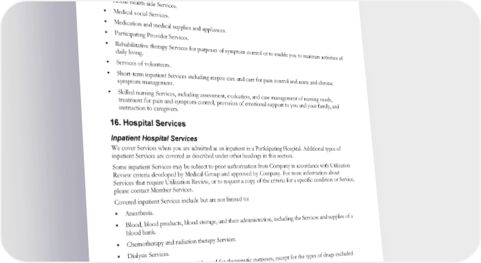 The Services are necessary for the palliation and management of your terminal illness and related conditions. The Services meet Kaiser Utilization Review criteria. The following hospice Services are covered: Counseling and bereavement Services for up to one year. Durable Medical Equipment (DME). Home health aide Services. Medical social Services. Medication and medical supplies and appliances. Participating Provider Services. Rehabilitative therapy Services for purposes of symptom control or to enable you to maintain activities of daily living. Services of volunteers. Short-term inpatient Services including respite care and care for pain control and acute and chronic symptom management. Skilled nursing Services, including assessment, evaluation, and case management of nursing needs, treatment for pain and symptom control, provision of emotional support to you and your family, and instruction to caregivers. 16. Hospital Services Inpatient Hospital Services We cover Services when you are admitted as an inpatient in a Participating Hospital. Additional types of inpatient Services are covered as described under other headings in this section. Some inpatient Services may be subject to prior authorization from Company in accordance with Utilization Review criteria developed by Medical Group and approved by Company. For more information about Services that require Utilization Review, or to request a copy of the criteria for a specific condition or Service, please contact Member Services. Covered inpatient Services include but are not limited to: Anesthesia. Blood, blood products, blood storage, and their administration, including the Services and supplies of a blood bank. Chemotherapy and radiation therapy Services. Dialysis Services. Drugs and radioactive materials used for therapeutic purposes, except for the types of drugs excluded under the “Prescription drugs, insulin, and diabetic supplies” section. Durable Medical Equipment and medical supplies. Emergency detoxification. Gender Affirming Treatment. General and special nursing care Services. EWCLGDED1983ACT0124 48 WAPEBB-CL-ACT