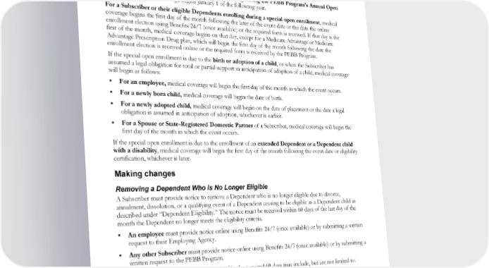 Retired employees of a former employer group and dependents For a retired employee of a former employer group and their eligible dependents enrolling when newly eligible, medical coverage begins the first day of the month following the day they lost eligibility for PEBB retiree insurance coverage. All Subscribers and Dependents For a Subscriber or their eligible Dependents enrolling during the PEBB Program’s Annual Open Enrollment, medical coverage begins January 1 of the following year. For a Subscriber or their eligible Dependents enrolling during a special open enrollment, medical coverage begins the first day of the month following the later of the event date or the date the online enrollment election using Benefits 24/7 (once available) or the required form is received. If that day is the first of the month, medical coverage begins on that day, except for a Medicare Advantage or Medicare Advantage Prescription Drug plan, which will begin the first day of the month following the date the enrollment election is received online or the required form is received by the PEBB Program. If the special open enrollment is due to the birth or adoption of a child, or when the Subscriber has assumed a legal obligation for total or partial support in anticipation of adoption of a child, medical coverage will begin as follows: For an employee, medical coverage will begin the first day of the month in which the event occurs. For a newly born child, medical coverage will begin the date of birth. For a newly adopted child, medical coverage will begin on the date of placement or the date a legal obligation is assumed in anticipation of adoption, whichever is earlier. For a Spouse or State-Registered Domestic Partner of a Subscriber, medical coverage will begin the first day of the month in which the event occurs. If the special open enrollment is due to the enrollment of an extended Dependent or a Dependent child with a disability, medical coverage will begin the first day of the month following the event date or eligibility certification, whichever is later. Making changes Removing a Dependent Who is No Longer Eligible A Subscriber must provide notice to remove a Dependent who is no longer eligible due to divorce, annulment, dissolution, or a qualifying event of a Dependent ceasing to be eligible as a Dependent child as described under “Dependent Eligibility.” The notice must be received within 60 days of the last day of the month the Dependent no longer meets the eligibility criteria. An employee must provide notice online using Benefits 24/7 (once available) or by submitting a written request to their Employing Agency. Any other Subscriber must provide notice online using Benefits 24/7 (once available) or by submitting a written request to the PEBB Program. Consequences for not submitting notice within the required 60 days may include, but are not limited to: The Dependent may lose eligibility to continue PEBB medical coverage under one of the Continuation Coverage options described in “Options for Continuing PEBB Medical Coverage.” The Subscriber may be billed for claims paid by the medical plan for Services that were rendered after the Dependent lost eligibility. The Subscriber may not be able to recover Subscriber-paid insurance premiums for the Dependent that lost eligibility. EWCLGDED1983ACT0124 20 WAPEBB-CL-ACT