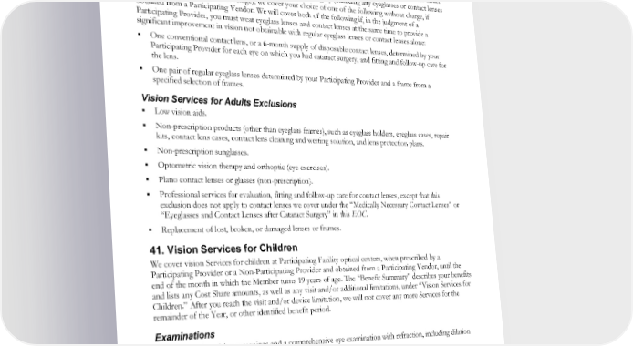 The evaluation, fitting, and follow-up is covered for Medically Necessary contact lenses. Medically Necessary contact lenses are subject to Utilization Review by Kaiser using criteria developed by Medical Group and approved by Kaiser. Eyeglasses and Contact Lenses after Cataract Surgery If you have cataract surgery and since that surgery we have never covered eyeglasses or contact lenses under any benefit for eyeglasses and contact lenses after cataract surgery (including any eyeglasses or contact lenses we covered under any other coverage), we cover your choice of one of the following without charge, if obtained from a Participating Vendor. We will cover both of the following if, in the judgment of a Participating Provider, you must wear eyeglass lenses and contact lenses at the same time to provide a significant improvement in vision not obtainable with regular eyeglass lenses or contact lenses alone: One conventional contact lens, or a 6-month supply of disposable contact lenses, determined by your Participating Provider for each eye on which you had cataract surgery, and fitting and follow-up care for the lens. One pair of regular eyeglass lenses determined by your Participating Provider and a frame from a specified selection of frames. Vision Services for Adults Exclusions Low vision aids. Non-prescription products (other than eyeglass frames), such as eyeglass holders, eyeglass cases, repair kits, contact lens cases, contact lens cleaning and wetting solution, and lens protection plans. Non-prescription sunglasses. Optometric vision therapy and orthoptic (eye exercises). Plano contact lenses or glasses (non-prescription). Professional services for evaluation, fitting and follow-up care for contact lenses, except that this exclusion does not apply to contact lenses we cover under the “Medically Necessary Contact Lenses” or “Eyeglasses and Contact Lenses after Cataract Surgery” in this EOC. Replacement of lost, broken, or damaged lenses or frames. 41. Vision Services for Children We cover vision Services for children at Participating Facility optical centers, when prescribed by a Participating Provider or a Non-Participating Provider and obtained from a Participating Vendor, until the end of the month in which the Member turns 19 years of age. The “Benefit Summary” describes your benefits and lists any Cost Share amounts, as well as any visit and/or additional limitations, under “Vision Services for Children.” After you reach the visit and/or device limitation, we will not cover any more Services for the remainder of the Year, or other identified benefit period. Examinations We cover routine vision screenings and a comprehensive eye examination with refraction, including dilation when determined to be Medically Necessary. Eyeglasses and Contact Lenses We cover one pair of eyeglass lenses (single vision, bifocal, lenticular, or trifocal, including polycarbonate lenses and scratch-resistant coating) determined by your Participating Provider and a frame, or contact lenses in lieu of eyeglasses. Prescription eyeglass lenses and frames, or contact lenses, including expenses associated with their fitting, is provided once per Year when obtained at a Participating Facility optical center. EWCLGDED1983ACT0124 71 WAPEBB-CL-ACT