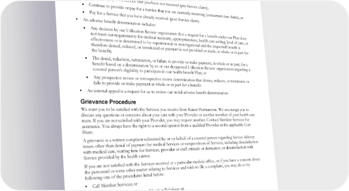 GRIEVANCES, CLAIMS, APPEALS, AND EXTERNAL REVIEW Terms We Use in this Section The following terms have the following meanings when used in this “Grievances, Claims, Appeals, and External Review” section: A claim is a request for us to: • Provide or pay for a Service that you have not received (pre-Service claim); • Continue to provide or pay for a Service that you are currently receiving (concurrent care claim); or • Pay for a Service that you have already received (post-Service claim). An adverse benefit determination includes: • Any decision by our Utilization Review organization that a request for a benefit under our Plan does not meet our requirements for medical necessity, appropriateness, health care setting, level of care, or effectiveness or is determined to be experimental or investigational and the requested benefit is therefore denied, reduced, or terminated or payment is not provided or made, in whole or in part for the benefit; • The denial, reduction, termination, or failure to provide or make payment, in whole or in part, for a benefit based on a determination by us or our designated Utilization Review organization regarding a covered person’s eligibility to participate in our health benefit Plan; or • Any prospective review or retrospective review determination that denies, reduces, or terminates or fails to provide or make payment in whole or in part for a benefit. An internal appeal is a request for us to review our initial adverse benefit determination. Grievance Procedure We want you to be satisfied with the Services you receive from Kaiser Permanente. We encourage you to discuss any questions or concerns about your care with your Provider or another member of your health care team. If you are not satisfied with your Provider, you may request another. Contact Member Services for assistance. You always have the right to a second opinion from a qualified Provider at the applicable Cost Share. A grievance is a written complaint submitted by or on behalf of a covered person regarding Service delivery issues other than denial of payment for medical Services or nonprovision of Services, including dissatisfaction with medical care, waiting time for Services, provider or staff attitude or demeanor, or dissatisfaction with Service provided by the health carrier. If you are not satisfied with the Services received at a particular medical office, or if you have a concern about the personnel or some other matter relating to Services and wish to file a complaint, you may do so by following one of the procedures listed below: Call Member Services; or Send your written complaint to Member Relations at: Kaiser Foundation Health Plan of the Northwest Member Relations Department 500 NE Multnomah St., Suite 100 Portland, OR 97232-2099 Fax: 1-855-347-7239 All complaints are handled in a confidential manner. EWCLGDED1983ACT0124 83 WAPEBB-CL-ACT