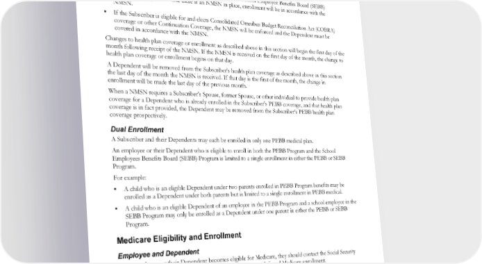An employee who has waived PEBB medical will be enrolled in medical as directed by the NMSN, in order to enroll the Dependent. The Subscriber’s selected health plans will be changed if directed by the NMSN. If the Dependent is already enrolled under another PEBB Subscriber, the Dependent will be removed from the other health plan coverage and enrolled as directed by the NMSN. If the Dependent is enrolled in both PEBB medical and School Employee Benefits Board (SEBB) medical as a Dependent and there is an NMSN in place, enrollment will be in accordance with the NMSN. If the Subscriber is eligible for and elects Consolidated Omnibus Budget Reconciliation Act (COBRA) coverage or other Continuation Coverage, the NMSN will be enforced and the Dependent must be covered in accordance with the NMSN. Changes to health plan coverage or enrollment as described above in this section will begin the first day of the month following receipt of the NMSN. If the NMSN is received on the first day of the month, the change to health plan coverage or enrollment begins on that day. A Dependent will be removed from the Subscriber’s health plan coverage as described above in this section the last day of the month the NMSN is received. If that day is the first of the month, the change in enrollment will be made the last day of the previous month. When a NMSN requires a Subscriber’s Spouse, former Spouse, or other individual to provide health plan coverage for a Dependent who is already enrolled in the Subscriber’s PEBB coverage, and that health plan coverage is in fact provided, the Dependent may be removed from the Subscriber’s PEBB health plan coverage prospectively. Dual Enrollment A Subscriber and their Dependents may each be enrolled in only one PEBB medical plan. An employee or their Dependent who is eligible to enroll in both the PEBB Program and the School Employees Benefits Board (SEBB) Program is limited to a single enrollment in either the PEBB or SEBB Program. For example: A child who is an eligible Dependent under two parents enrolled in PEBB Program benefits may be enrolled as a Dependent under both parents but is limited to a single enrollment in PEBB medical. A child who is an eligible Dependent of an employee in the PEBB Program and a school employee in the SEBB Program may only be enrolled as a Dependent under one parent in either the PEBB or SEBB Program. Medicare Eligibility and Enrollment Employee and Dependent If an employee or their Dependent becomes eligible for Medicare, they should contact the Social Security Administration to ask about the advantages of immediate or deferred Medicare enrollment. An employee or their Dependent are deemed eligible for Medicare when they have the option to receive Medicare Part A benefits. If an employee or their Dependent chooses to enroll in Medicare Part A, Medicare regulations and guidelines will determine whether Medicare is the primary or secondary payer. An employee or their Dependent who is enrolled in Medicare may remain enrolled in PEBB medical coverage. However, an employee may choose to waive their PEBB medical coverage or remove their Dependent from their PEBB medical coverage and choose Medicare as their primary insurer. If an employee EWCLGDED1983ACT0124 18 WAPEBB-CL-ACT