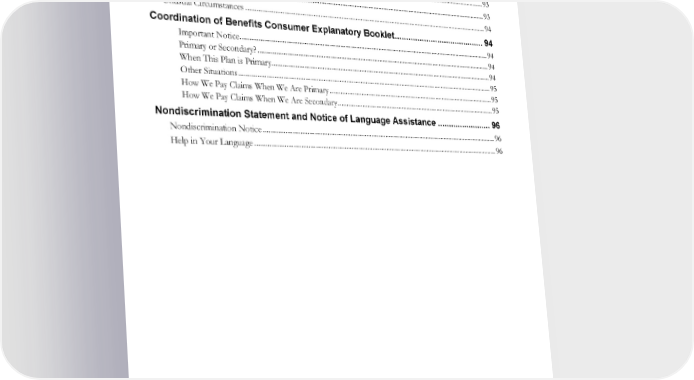 External Review ......................................................................................................................................................... 91 Experimental or Investigational Determination and Appeal .............................................................................. 92 Miscellaneous Provisions ............................................................................................ 93 Exercise of Conscience ............................................................................................................................................ 93 Information about New Technology ..................................................................................................................... 93 Privacy Practices ........................................................................................................................................................ 93 Unusual Circumstances ............................................................................................................................................ 94 Coordination of Benefits Consumer Explanatory Booklet ........................................ 94 Important Notice ................................................................................................................................................ 94 Primary or Secondary? ....................................................................................................................................... 94 When This Plan is Primary................................................................................................................................ 94 Other Situations .................................................................................................................................................. 95 How We Pay Claims When We Are Primary ................................................................................................. 95 How We Pay Claims When We Are Secondary ............................................................................................. 95 Nondiscrimination Statement and Notice of Language Assistance ........................ 96 Nondiscrimination Notice ....................................................................................................................................... 96 Help in Your Language ............................................................................................................................................ 96 EWCLGDED1983ACT0124 WAPEBB-CL-ACT
