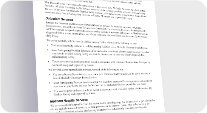 Mental health Services are subject to Utilization Review by Kaiser using criteria developed by Medical Group and approved by Kaiser. You may request these criteria by calling Member Services. We cover Participating Provider Services under this “Mental Health Services” section only if they are provided by a licensed psychiatrist, licensed psychologist, licensed clinical social worker, licensed mental health counselor, licensed professional counselor, licensed marriage and family therapist, advanced practice psychiatric nurse, licensed behavioral analyst, licensed assistant behavioral analyst or registered behavioral analyst interventionist. The benefits described in this “Mental Health Services” section comply with the Mental Health Parity and Addiction Equity Act. This Plan will cover court-ordered treatment only if determined to be Medically Necessary by a Participating Provider. All costs for mental health Services in excess of the coverage provided under this EOC, including the cost of any care for which the Member failed to obtain prior authorization, or any Services received from someone other than a Participating Provider will be the Member’s sole responsibility to pay. Outpatient Services Services for diagnosis and treatment of mental illness are covered for intensive outpatient visit, partial hospitalization, and without charge for Assertive Community Treatment (ACT) Services for mental health. ACT Services are designed to provide comprehensive outpatient treatment and support to Members who are diagnosed with a severe mental illness and whose symptoms of mental illness lead to serious dysfunction in daily living. We cover mental health Services in a skilled nursing facility, when all of the following are true: You are substantially confined to a skilled nursing facility in lieu of Medically Necessary hospitalization. Your Participating Provider determines that it is feasible to maintain effective supervision and control of your care in a skilled nursing facility and that the Services can be safely and effectively provided in a skilled nursing facility. You receive prior authorization from Kaiser in accordance with Utilization Review criteria developed by Medical Group and approved by Kaiser. We cover in home mental health Services, when all of the following are true: You are substantially confined to your home (or a friend’s or relative’s home), or the care is provided in lieu of Medically Necessary hospitalization. Your Participating Provider determines that it is feasible to maintain effective supervision and control of your care in your home and that the Services can be safely and effectively provided in your home. You receive prior authorization from Kaiser in accordance with Utilization Review criteria developed by Medical Group and approved by Kaiser. Inpatient Hospital Services We cover inpatient hospital Services for mental health, including drugs that are prescribed as part of your plan of care and administered to you by medical personnel in the inpatient facility. Prior authorization is not required for Members who are involuntarily committed and subsequently treated in a state hospital. Residential Services We cover residential Services in a residential facility, including drugs that are prescribed as part of your plan of care and administered to you by medical personnel in the residential facility. Psychological Testing If, in the professional judgment of a Participating Provider you require psychological testing as part of diagnostic evaluation, prescribed tests are covered in accord with this “Mental Health Services” section. We EWCLGDED1983ACT0124 53 WAPEBB-CL-ACT