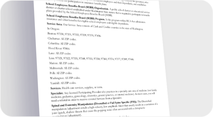 Public Employees Benefits Board (PEBB). A group of representatives, appointed by the governor, who approves insurance benefit plans for employees and their dependents, and establishes eligibility criteria for participation in insurance benefit plans. Public Employees Benefits Board (PEBB) Program. Is the HCA program that administers PEBB benefit eligibility and enrollment. School Employees Benefits Board (SEBB). A group of representatives, appointed by the governor, who designs and approves insurance benefit plans for school employees and their dependents, and establishes eligibility criteria for participation in insurance benefit plans. School Employees Benefits Board (SEBB) Organization. A public school district or educational service district or charter school established under Washington State statute that is required to participate in benefit plans provided by the School Employees Benefits Board (SEBB). School Employees Benefits Board (SEBB) Program. Is the program within HCA that administers insurance and other benefits for eligible school employees and eligible dependents. Service Area. Our Service Area consists of Clark and Cowlitz counties in the state of Washington. In Oregon: Benton: 97330, 97331, 97333, 97339, 97370, 97456. Clackamas: All ZIP codes. Columbia: All ZIP codes. Hood River: 97014. Lane: All ZIP codes. Linn: 97321, 97322, 97335, 97348, 97355, 97358, 97360, 97374, 97377, 97389, 97446. Marion: All ZIP codes. Multnomah: All ZIP codes. Polk: All ZIP codes. Washington: All ZIP codes. Yamhill: All ZIP codes. Services. Health care services, supplies, or items. Specialist. Any licensed Participating Provider who practices in a specialty care area of medicine (not family medicine, pediatrics, gynecology, obstetrics, general practice, or internal medicine). In most cases, you will need a referral in order to receive covered Services from a Specialist. Spinal and Extremity Manipulation (Diversified or Full Spine Specific (FSS)). The Diversified manipulation/adjustment entails a high-velocity, low amplitude thrust that usually results in a cavitation of a joint (quick, shallow thrusts that cause the popping noise often associated with a chiropractic manipulation/adjustment). Spouse. The person to whom you are legally married under applicable law. Stabilize. With respect to an Emergency Medical Condition, to provide the medical treatment of the condition that is necessary to assure, within reasonable medical probability that no material deterioration of the condition is likely to result from or occur during the transfer of the person from the facility. With respect to a pregnant woman who is having contractions, when there is inadequate time to safely transfer her to another hospital before delivery (or the transfer may pose a threat to the health or safety of the woman or unborn child), “Stabilize” means to deliver the infant (including the placenta). EWCLGDED1983ACT0124 13 WAPEBB-CL-ACT