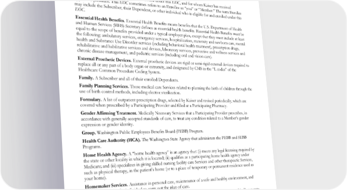 been furnished, if the Non-Participating Provider determines that, taking into account your medical or behavioral health condition, you are not able to travel to an available Participating Provider within a reasonable travel distance, using non-medical transportation or non-emergency transportation. Employing Agency. A division, department, or separate agency of state government, including an institution of higher education; a county, municipality, or other political subdivision; and a tribal government covered by HCA statute. Enrollee. A person who is eligible and enrolled under this EOC, and for whom Kaiser has received applicable premium. This EOC sometimes refers to an Enrollee as “you” or “Member.” The term Enrollee may include the Subscriber, their Dependent, or other individual who is eligible for and enrolled under this EOC. Essential Health Benefits. Essential Health Benefits means benefits that the U.S. Department of Health and Human Services (HHS) Secretary defines as essential health benefits. Essential Health Benefits must be equal to the scope of benefits provided under a typical employer plan, except that they must include at least the following: ambulatory services, emergency services, hospitalization, maternity and newborn care, mental health and Substance Use Disorder services (including behavioral health treatment), prescription drugs, rehabilitative and habilitative services and devices, laboratory services, preventive and wellness services and chronic disease management, and pediatric services (including oral and vision care). External Prosthetic Devices. External prosthetic devices are rigid or semi-rigid external devices required to replace all or any part of a body organ or extremity, and designated by CMS in the “L codes” of the Healthcare Common Procedure Coding System. Family. A Subscriber and all of their enrolled Dependents. Family Planning Services. Those medical care Services related to planning the birth of children through the use of birth control methods, including elective sterilization. Formulary. A list of outpatient prescription drugs, selected by Kaiser and revised periodically, which are covered when prescribed by a Participating Provider and filled at a Participating Pharmacy. Gender Affirming Treatment. Medically Necessary Services that a Participating Provider prescribes, in accordance with generally accepted standards of care, to treat any condition related to a Member’s gender expression or gender identity. Group. Washington Public Employees Benefits Board (PEBB) Program. Health Care Authority (HCA). The Washington State Agency that administers the PEBB and SEBB Programs. Home Health Agency. A “home health agency” is an agency that: (i) meets any legal licensing required by the state or other locality in which it is located; (ii) qualifies as a participating home health agency under Medicare; and (iii) specializes in giving skilled nursing facility care Services and other therapeutic Services, such as physical therapy, in the patient’s home (or to a place of temporary or permanent residence used as your home). Homemaker Services. Assistance in personal care, maintenance of a safe and healthy environment, and Services to enable the individual to carry out the plan of care. Independent Freestanding Emergency Department. A health care facility that is geographically separate and distinct and licensed separately from a hospital under applicable State law and that provides Emergency Services. Kaiser. Kaiser Foundation Health Plan of the Northwest, an Oregon nonprofit corporation, who provides Services and benefits for Members enrolled in this Plan - Public Employees Benefits Board (PEBB) Program. This EOC sometimes refers to Kaiser as “we,” “our,” or “us.” EWCLGDED1983ACT0124 10 WAPEBB-CL-ACT