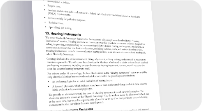 Habilitative Services Exclusions Activities that provide diversion or general motivation. Custodial care or services for individualized education program development. Daycare. Exercise programs for healthy individuals. Housing. Recreational activities. Respite care. Services and devices delivered pursuant to federal Individuals with Disabilities Education Act of 2004 (IDEA) requirements. Services solely for palliative purposes. Social services. Specialized job testing. 13. Hearing Instruments We cover Medically Necessary Services for the treatment of hearing loss as described in this “Hearing Instruments” section. Hearing instruments means any wearable prosthetic instrument or device designed for aiding, improving, compensating for, or correcting defective human hearing, and any parts, attachments, or accessories necessary for the device to function, excluding batteries, cords, and assistive listening devices. Hearing instruments include bone conduction hearing devices, as an alternative to conventional hearing aids, when Medically Necessary. Coverage includes the initial assessment, fitting, adjustment, auditory training, and ear molds as necessary to maintain optimal fit. We will cover these Services for Members who intend to obtain or have already obtained any hearing instrument, including an over-the-counter hearing instrument; however, we will not cover the over-the-counter hearing instrument itself. For minors under 18 years of age, the benefits described in this “Hearing Instruments” section are available only after the Member has received medical clearance within the preceding six months from: An otolaryngologist for an initial evaluation of hearing loss; or A licensed physician, which indicates there has not been a substantial change in clinical status since the initial evaluation by an otolaryngologist. We provide an allowance toward the price of a hearing instrument for each ear with hearing loss. The allowance amount is shown in the “Benefit Summary.” You do not have to use the allowances for both ears at the same time, but we will not provide the allowance for an ear if we have previously covered a hearing instrument for that ear within the same benefit period. Hearing Instruments Exclusions Assistive listening devices (for example, FM systems, cell phone or telephone amplifiers, and personal amplifiers designed to improve your ability to hear in a specific listening situation). Batteries, cords, cleaners, and moisture guards. Over-the-counter (non-prescription) hearing instruments. Repair of hearing instruments beyond the warranty period. Replacement of lost or broken hearing aids if you have exhausted (used up) your allowance. EWCLGDED1983ACT0124 46 WAPEBB-CL-ACT