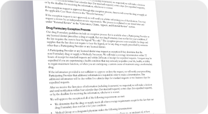 health, or ability to regain maximum function, or when you are undergoing a current course of treatment using a nonformulary drug. If the information provided is not sufficient to approve or deny the request, we will notify your prescribing Participating Provider that additional information is required in order to make a determination. This additional information will be due within five calendar days for standard requests or two business days for expedited requests. After we receive the first piece of information (including documents) we requested, we will make a decision and send notification within four calendar days (for standard requests) or two days (for expedited requests), or by the deadline for receiving the information, whichever is sooner. If the exception request is approved through this exception process, then we will cover the drug or supply at the applicable Cost Share shown in the “Benefit Summary.” If the exception request is not approved, we will send you a letter informing you of that decision. You may request a review by an independent review organization. The process is explained in our denial letter and under “External Review” in the “Grievances, Claims, Appeals, and External Review” section. Drug Formulary Exception Process Our drug Formulary guidelines include an exception process that is available when a Participating Provider or any licensed dentist prescribes a drug or supply that our drug Formulary does not list for your condition, if the law requires the item to bear the legend “Rx only.” The exception process is not available for drugs and supplies that the law does not require to bear this legend, or for any drug or supply prescribed by someone other than a Participating Provider or any licensed dentist. A Participating Provider or any licensed dentist may request an exception if they determine that the non-Formulary drug or supply is Medically Necessary. We will make a coverage determination within 72 hours of receipt for standard requests and within 24 hours of receipt for expedited requests. A request may be expedited if you are experiencing a health condition that may seriously jeopardize your life, health, or ability to regain maximum function, or when you are undergoing a current course of treatment using a nonformulary drug. If the information provided is not sufficient to approve or deny the request, we will notify your prescribing Participating Provider that additional information is required in order to make a determination. This additional information will be due within five calendar days for standard requests or two business days for expedited requests. After we receive the first piece of information (including documents) we requested, we will make a decision and send notification within four calendar days (for standard requests) or two days (for expedited requests), or by the deadline for receiving the information, whichever is sooner. We will approve the exception if all of the following requirements are met: We determine that the drug or supply meets all other coverage requirements except for the fact that our drug Formulary does not list it for your condition. Medical Group or a designated physician makes the following determinations: • The drug or supply is Medically Necessary because you are allergic to, or intolerant of, or have experienced treatment failure with, any alternative drugs or supplies that our drug Formulary lists for your condition. • Your condition meets any additional requirements that the Regional Formulary and Therapeutics Committee has approved for the drug or supply. For this drug or supply, the pharmacy can provide a copy of the additional criteria upon request. In some cases, there may be a short delay in filling your prescription while your information is being reviewed. EWCLGDED1983ACT0124 61 WAPEBB-CL-ACT