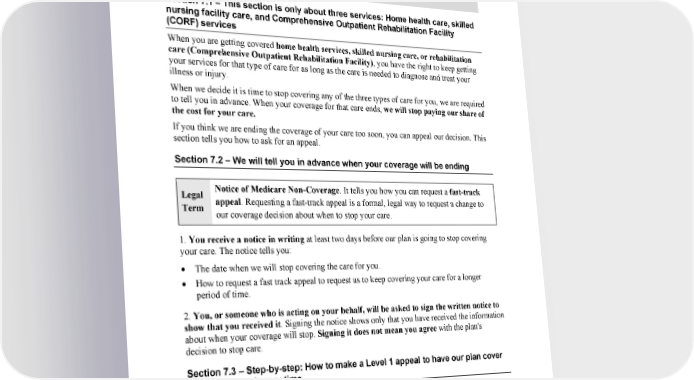 86 2024 Evidence of Coverage for WA PEBB Kaiser Permanente Senior Advantage Chapter 7: What to do if you have a problem or complaint (coverage decisions, appeals, complaints) Section 7 — How to ask us to keep covering certain medical services if you think your coverage is ending too soon Section 7.1 – This section is only about three services: Home health care, skilled nursing facility care, and Comprehensive Outpatient Rehabilitation Facility (CORF) services When you are getting covered home health services, skilled nursing care, or rehabilitation care (Comprehensive Outpatient Rehabilitation Facility), you have the right to keep getting your services for that type of care for as long as the care is needed to diagnose and treat your illness or injury. When we decide it is time to stop covering any of the three types of care for you, we are required to tell you in advance. When your coverage for that care ends, we will stop paying our share of the cost for your care. If you think we are ending the coverage of your care too soon, you can appeal our decision. This section tells you how to ask for an appeal. Section 7.2 – We will tell you in advance when your coverage will be ending Legal Notice of Medicare Non-Coverage. It tells you how you can request a fast-track Term appeal. Requesting a fast-track appeal is a formal, legal way to request a change to our coverage decision about when to stop your care. 1. You receive a notice in writing at least two days before our plan is going to stop covering your care. The notice tells you: • The date when we will stop covering the care for you. • How to request a fast track appeal to request us to keep covering your care for a longer period of time. 2. You, or someone who is acting on your behalf, will be asked to sign the written notice to show that you received it. Signing the notice shows only that you have received the information about when your coverage will stop. Signing it does not mean you agree with the plan's decision to stop care. Section 7.3 – Step-by-step: How to make a Level 1 appeal to have our plan cover your care for a longer time If you want to ask us to cover your care for a longer period of time, you will need to use the appeals process to make this request. Before you start, understand what you need to do and what the deadlines are. • Follow the process. • Meet the deadlines. kp.org