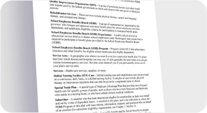 112 2024 Evidence of Coverage for WA PEBB Kaiser Permanente Senior Advantage Chapter 10: Definitions of important words Public Employees Benefits Board (PEBB) – A group of representatives, appointed by the governor, who approves insurance benefit plans for employees and their dependents, and establishes eligibility criteria for participation in insurance benefit plans. Public Employees Benefits Board (PEBB) Program – HCA program that administers PEBB benefit eligibility and enrollment. Quality Improvement Organization (QIO) – A group of practicing doctors and other health care experts paid by the federal government to check and improve the care given to Medicare patients. Rehabilitation Services – These services include physical therapy, speech and language therapy, and occupational therapy. School Employees Benefits Board (SEBB) – A group of representatives, appointed by the governor, who designs and approves insurance benefit plans for school employees and their dependents, and establishes eligibility criteria for participation in insurance benefit plans. School Employees Benefits Board (SEBB) Organization – A public school district or educational service district or charter school established under Washington state statute that is required to participate in benefit plans provided by the School Employees Benefits Board (SEBB). School Employees Benefits Board (SEBB) Program – Program within HCA that administers insurance and other benefits for eligible school employees and eligible dependents. Service Area – A geographic area where you must live to join a particular health plan. For plans that limit which doctors and hospitals you may use, it's also generally the area where you can get routine (nonemergency) services. Our plan must disenroll you if you permanently move out of your plan's service area. Services – Health care services, supplies, or items. Skilled Nursing Facility (SNF) Care – Skilled nursing care and rehabilitation services provided on a continuous, daily basis, in a skilled nursing facility. Examples of care include physical therapy or intravenous injections that can only be given by a registered nurse or doctor. Special Needs Plan – A special type of Medicare Advantage Plan that provides more focused health care for specific groups of people, such as those who have both Medicare and Medicaid, who reside in a nursing home, or who have certain chronic medical conditions. Subscriber – A member who has been determined eligible for membership on their own behalf and not by virtue of dependent status , is enrolled in this plan, and is the individual to whom the PEBB Program or this plan will issue notices, information, requests, and premium bills on behalf of an enrollee (for subscriber eligibility requirements, see Chapter 1, Section 2). Supplemental Security Income (SSI) – A monthly benefit paid by Social Security to people with limited income and resources who are disabled, blind, or age 65 and older. SSI benefits are not the same as Social Security benefits. Urgently Needed Services – Covered services that are not emergency services, provided when the network providers are temporarily unavailable or inaccessible or when the enrollee is out of the service area. For example, you need immediate care during the weekend. Services must be immediately needed and medically necessary. kp.org