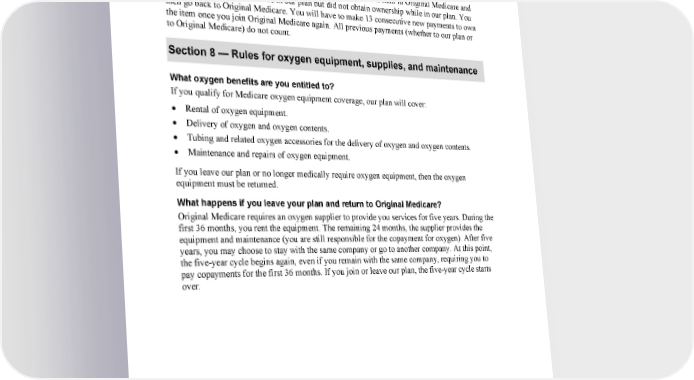 50 2024 Evidence of Coverage for WA PEBB Kaiser Permanente Senior Advantage Chapter 3: Using our plan for your medical services Example 1: You made 12 or fewer consecutive payments for the item in Original Medicare and then joined our plan. The payments you made in Original Medicare do not count. You will have to make 13 payments to our plan before owning the item. Example 2: You made 12 or fewer consecutive payments for the item in Original Medicare and then joined our plan. You were in our plan but did not obtain ownership while in our plan. You then go back to Original Medicare. You will have to make 13 consecutive new payments to own the item once you join Original Medicare again. All previous payments (whether to our plan or to Original Medicare) do not count. Section 8 — Rules for oxygen equipment, supplies, and maintenance What oxygen benefits are you entitled to? If you qualify for Medicare oxygen equipment coverage, our plan will cover: • Rental of oxygen equipment. • Delivery of oxygen and oxygen contents. • Tubing and related oxygen accessories for the delivery of oxygen and oxygen contents. • Maintenance and repairs of oxygen equipment. If you leave our plan or no longer medically require oxygen equipment, then the oxygen equipment must be returned. What happens if you leave your plan and return to Original Medicare? Original Medicare requires an oxygen supplier to provide you services for five years. During the first 36 months, you rent the equipment. The remaining 24 months, the supplier provides the equipment and maintenance (you are still responsible for the copayment for oxygen). After five years, you may choose to stay with the same company or go to another company. At this point, the five-year cycle begins again, even if you remain with the same company, requiring you to pay copayments for the first 36 months. If you join or leave our plan, the five-year cycle starts over. kp.org