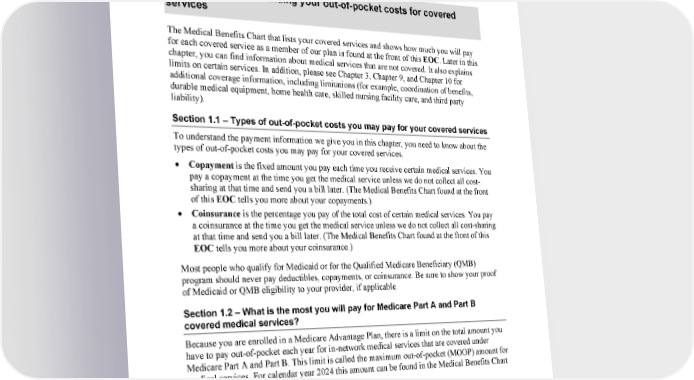 2024 Evidence of Coverage for WA PEBB Kaiser Permanente Senior Advantage 51 Chapter 4: Medical Benefits Chart (what is covered and what you pay) Chapter 4 — Medical Benefits Chart (what is covered and what you pay) Section 1 — Understanding your out-of-pocket costs for covered services The Medical Benefits Chart that lists your covered services and shows how much you will pay for each covered service as a member of our plan is found at the front of this EOC. Later in this chapter, you can find information about medical services that are not covered. It also explains limits on certain services. In addition, please see Chapter 3, Chapter 9, and Chapter 10 for additional coverage information, including limitations (for example, coordination of benefits, durable medical equipment, home health care, skilled nursing facility care, and third party liability). Section 1.1 – Types of out-of-pocket costs you may pay for your covered services To understand the payment information we give you in this chapter, you need to know about the types of out-of-pocket costs you may pay for your covered services. • Copayment is the fixed amount you pay each time you receive certain medical services. You pay a copayment at the time you get the medical service unless we do not collect all cost- sharing at that time and send you a bill later. (The Medical Benefits Chart found at the front of this EOC tells you more about your copayments.) • Coinsurance is the percentage you pay of the total cost of certain medical services. You pay a coinsurance at the time you get the medical service unless we do not collect all cost-sharing at that time and send you a bill later. (The Medical Benefits Chart found at the front of this EOC tells you more about your coinsurance.) Most people who qualify for Medicaid or for the Qualified Medicare Beneficiary (QMB) program should never pay deductibles, copayments, or coinsurance. Be sure to show your proof of Medicaid or QMB eligibility to your provider, if applicable. Section 1.2 – What is the most you will pay for Medicare Part A and Part B covered medical services? Because you are enrolled in a Medicare Advantage Plan, there is a limit on the total amount you have to pay out-of-pocket each year for in-network medical services that are covered under Medicare Part A and Part B. This limit is called the maximum out-of-pocket (MOOP) amount for medical services. For calendar year 2024 this amount can be found in the Medical Benefits Chart at the front of this EOC. The amounts you pay for copayments and coinsurance for in-network covered services count toward this maximum out-of-pocket amount. In addition, amounts you pay for some services do not count toward your maximum out-of-pocket amount. These services are marked with an asterisk (*) in the Medical Benefits Chart. If you reach the maximum out-of-pocket amount stated in the Medical Benefits Chart at the front of the EOC, you will not have to pay any out-of- 1-877-221-8221 (TTY 711), 7 days a week, 8 a.m. to 8 p.m.
