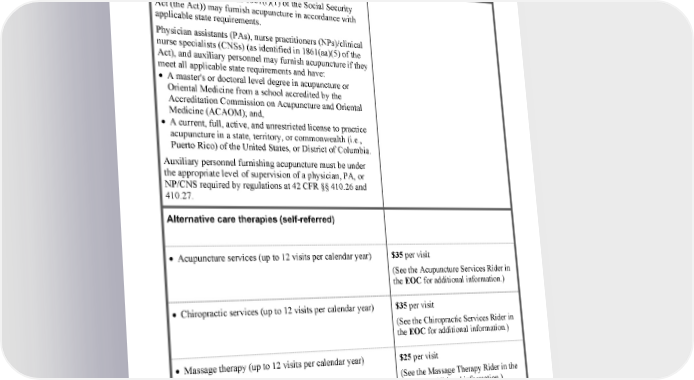 2 2024 Evidence of Coverage for WA PEBB Kaiser Permanente Senior Advantage Medical Benefits Chart Services that are covered for you What you must pay when you get these services Provider requirements: Physicians (as defined in 1861(r)(1) of the Social Security Act (the Act)) may furnish acupuncture in accordance with applicable state requirements. Physician assistants (PAs), nurse practitioners (NPs)/clinical nurse specialists (CNSs) (as identified in 1861(aa)(5) of the Act), and auxiliary personnel may furnish acupuncture if they meet all applicable state requirements and have: • A master's or doctoral level degree in acupuncture or Oriental Medicine from a school accredited by the Accreditation Commission on Acupuncture and Oriental Medicine (ACAOM); and, • A current, full, active, and unrestricted license to practice acupuncture in a state, territory, or commonwealth (i.e., Puerto Rico) of the United States, or District of Columbia. Auxiliary personnel furnishing acupuncture must be under the appropriate level of supervision of a physician, PA, or NP/CNS required by regulations at 42 CFR §§ 410.26 and 410.27. Alternative care therapies (self-referred) • Acupuncture services (up to 12 visits per calendar year) $35 per visit (See the Acupuncture Services Rider in the EOC for additional information.) • Chiropractic services (up to 12 visits per calendar year) $35 per visit (See the Chiropractic Services Rider in the EOC for additional information.) • Massage therapy (up to 12 visits per calendar year) $25 per visit (See the Massage Therapy Rider in the EOC for additional information.) • Naturopathic medicine $25 per visit † Your provider must obtain prior authorization from our plan. * Your cost-sharing for these services or items doesn't apply toward the maximum out-of-pocket amount. kp.org