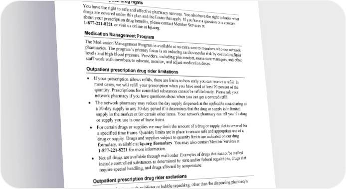 • delay in treatment would result in imminent emergency care, hospital admission or might seriously jeopardize the life or health of the patient or others in contact with the patient. An emergency fill must be received at a network pharmacy and is subject to the applicable cost- sharing shown in the Medical Benefits Chart. An emergency fill is limited to no more than a seven-day supply or the minimum packaging size available. Your prescription drug rights You have the right to safe and effective pharmacy services. You also have the right to know what drugs are covered under this plan and the limits that apply. If you have a question or a concern about your prescription drug benefits, please contact Member Services at 1-877-221-8221 or visit us online at kp.org. Medication Management Program The Medication Management Program is available at no extra cost to members who use network pharmacies. The program’s primary focus is on reducing cardiovascular risk by c ontrolling lipid levels and high blood pressure. Providers, including pharmacists, nurse care managers, and other staff work with members to educate, monitor, a nd adjust medication doses. Outpatient prescription drug rider limitations • If your prescription allows refills, there are limits to how early you can receive a refill. In most cases, we will refill your prescription when you have used at least 70 percent of the quantity. P rescriptions for controlled substances cannot be refilled early. Please ask your network pharmacy if you have questions about when you can get a covered refill. • The network ph armacy may reduce the day supply dispensed at the applicable cost-sharing t o a 30-day supply in any 30-day period if it determines that the drug or supply is in limited supply in the market or for certain other items. Your network pha rmacy can tell you if a drug or supply you use is one of these items. • For certain drugs or supplies we may limit the amount of a drug or supply that is covered for a specified time frame. Quantity limits are in place to ensure safe and appropriate use of a drug or supply. Drugs and supplies subject to quantity limits are indicated on our drug formulary, available at kp.org /formulary. You may also contact Member Services at 1-877-221-8221 for more information. • Not all drugs are available through mail order. Examples of drugs that cannot be mailed include controlled substances as determined by state and/or federal regulations, drugs that require special handling, and drugs affected by temperature. Outpatient prescription drug rider exclusions • Any packaging, such as blister or bubble repacking, other than the dispensing pharmacy's standard packaging. • Brand-name drugs for which a generic drug is available, unless approved. Refer to the "Prior authorization and step therapy prescribing criteria" section in this rider. • Drugs prescribed for an indication if the FDA has determined that use of that drug for that indication is contraindicated. RSARX0124 5