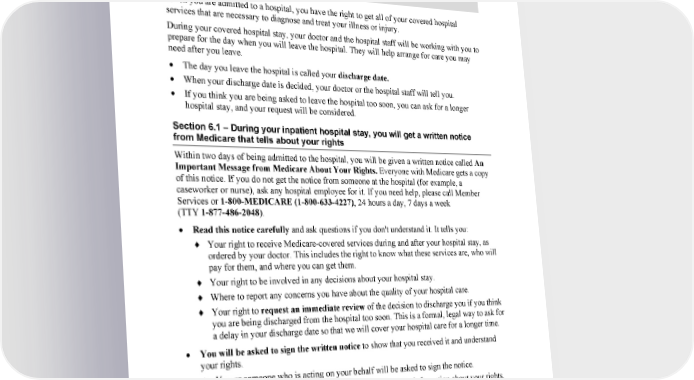 80 2024 Evidence of Coverage for WA PEBB Kaiser Permanente Senior Advantage Chapter 7: What to do if you have a problem or complaint (coverage decisions, appeals, complaints) Section 6 — How to ask us to cover a longer inpatient hospital stay if you think you are being discharged too soon When you are admitted to a hospital, you have the right to get all of your covered hospital services that are necessary to diagnose and treat your illness or injury. During your covered hospital stay, your doctor and the hospital staff will be working with you to prepare for the day when you will leave the hospital. They will help arrange for care you may need after you leave. • The day you leave the hospital is called your discharge date. • When your discharge date is decided, your doctor or the hospital staff will tell you. • If you think you are being asked to leave the hospital too soon, you can ask for a longer hospital stay, and your request will be considered. Section 6.1 – During your inpatient hospital stay, you will get a written notice from Medicare that tells about your rights Within two days of being admitted to the hospital, you will be given a written notice called An Important Message from Medicare About Your Rights. Everyone with Medicare gets a copy of this notice. If you do not get the notice from someone at the hospital (for example, a caseworker or nurse), ask any hospital employee for it. If you need help, please call Member Services or 1-800-MEDICARE (1-800-633-4227), 24 hours a day, 7 days a week (TTY 1-877-486-2048). • Read this notice carefully and ask questions if you don't understand it. It tells you: ♦ Your right to receive Medicare-covered services during and after your hospital stay, as ordered by your doctor. This includes the right to know what these services are, who will pay for them, and where you can get them. ♦ Your right to be involved in any decisions about your hospital stay. ♦ Where to report any concerns you have about the quality of your hospital care. ♦ Your right to request an immediate review of the decision to discharge you if you think you are being discharged from the hospital too soon. This is a formal, legal way to ask for a delay in your discharge date so that we will cover your hospital care for a longer time. • You will be asked to sign the written notice to show that you received it and understand your rights. ♦ You or someone who is acting on your behalf will be asked to sign the notice. ♦ Signing the notice shows only that you have received the information about your rights. The notice does not give your discharge date. Signing the notice does not mean you are agreeing on a discharge date. • Keep your copy of the notice handy so you will have the information about making an appeal (or reporting a concern about quality of care) if you need it. kp.org