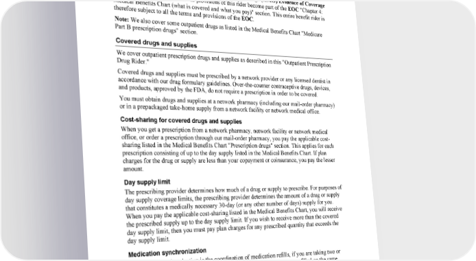 Outpatient Prescription Drug Rider Kaiser Permanente Senior Advantage ( HMO) This rider is part of the Kaiser Permanente Senior Advantage (HMO) Evidence of Coverage (EOC) to which it is attached. All provisions of this rider become part of the EOC "Chapter 4: Medical Benefits Chart (what is covered and what you pay)" section. This entire benefit rider is therefore subject to all the terms and provisions of the EOC. Note: We also cover some outpatient drugs as listed in the Medical Benefits Chart "Medicare Part B prescription drugs" section. Covered drugs and supplies We cover outpatient prescription drugs and supplies as described in this "Outpatient Prescription Drug Rider." Covered drugs and supplies must be prescribed by a network provider or any licensed dentist in accordance with our drug formulary guidelines. Over-the-counter contraceptive drugs, devices, and products, approved by the FDA, do not require a prescription i n order to be covered. You must obtain drugs and supplies at a network pharmacy (including our mail-order pharmacy) or in a prepackaged take-home supply from a network facility or network medical office. Cost-sharing for covered drugs and supplies When you get a prescription from a network pharmacy, network facility or network medical office, or order a prescription through our mail-order pharmacy, you pa y the applicable cost- sharing listed in the Medical Benefits Chart "Prescription drugs" section. T his applies for each prescription consisting of up to the day supply listed in the Medical Benefits Chart. If plan charges for the drug or supply are less than your copayment or coinsurance, you pay the lesser amount. Day supply limit The prescribing provider determines how much of a drug or supply to prescribe. For purposes of day supply coverage limits, the prescribing provider determines the amount of a drug or supply that constitutes a medically necessary 30-day (or any other number of days) supply for you. When you pay the applicable cost-sharing listed in the Medical Benefits Chart, you will receive the prescribed supply up to the day supply limit. If you wish to receive more than the covered day supply limit, then you must pay plan charges for any prescribed quantity that exceeds the day supply limit. Medication synchronization Medication synchronization is the coordination of medication refills, if you are taking two or more medications for a chronic condition, so that your medications are refilled on the same schedule. You may request medication synchronization for a new prescription from the prescribing provider or a network pharmacy who will determine the appropriateness of medication synchronization for the drugs being dispensed and inform you of the decision. RSARX0124 1