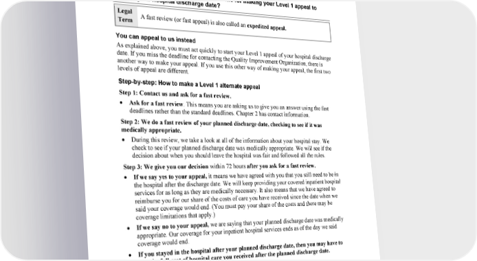 84 2024 Evidence of Coverage for WA PEBB Kaiser Permanente Senior Advantage Chapter 7: What to do if you have a problem or complaint (coverage decisions, appeals, complaints) • The Level 3 appeal is handled by an Administrative Law Judge or attorney adjudicator. Section 8 in this chapter tells you more about Levels 3, 4, and 5 of the appeals process. Section 6.4 – What if you miss the deadline for making your Level 1 appeal to change your hospital discharge date? Legal A fast review (or fast appeal) is also called an expedited appeal. Term You can appeal to us instead As explained above, you must act quickly to start your Level 1 appeal of your hospital discharge date. If you miss the deadline for contacting the Quality Improvement Organization, there is another way to make your appeal. If you use this other way of making your appeal, the first two levels of appeal are different. Step-by-step: How to make a Level 1 alternate appeal Step 1: Contact us and ask for a fast review. • Ask for a fast review. This means you are asking us to give you an answer using the fast deadlines rather than the standard deadlines. Chapter 2 has contact information. Step 2: We do a fast review of your planned discharge date, checking to see if it was medically appropriate. • During this review, we take a look at all of the information about your hospital stay. We check to see if your planned discharge date was medically appropriate. We will see if the decision about when you should leave the hospital was fair and followed all the rules. Step 3: We give you our decision within 72 hours after you ask for a fast review. • If we say yes to your appeal, it means we have agreed with you that you still need to be in the hospital after the discharge date. We will keep providing your covered inpatient hospital services for as long as they are medically necessary. It also means that we have agreed to reimburse you for our share of the costs of care you have received since the date when we said your coverage would end. (You must pay your share of the costs and there may be coverage limitations that apply.) • If we say no to your appeal, we are saying that your planned discharge date was medically appropriate. Our coverage for your inpatient hospital services ends as of the day we said coverage would end. • If you stayed in the hospital after your planned discharge date, then you may have to pay the full cost of hospital care you received after the planned discharge date. kp.org