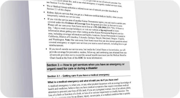 44 2024 Evidence of Coverage for WA PEBB Kaiser Permanente Senior Advantage Chapter 3: Using our plan for your medical services Section 2.4 – How to get care from out-of-network providers Care you receive from an out-of-network provider will not be covered except in the following situations: • Emergency or urgently needed services that you get from an out-of-network provider. For more information about this, and to see what emergency or urgently needed services mean, see Section 3 in this chapter. • We or Medical Group authorize a referral to an out-of-network provider described in Section 2.3 of this chapter. • Kidney dialysis services that you get at a Medicare-certified dialysis facility when you are temporarily outside our service area. • If you visit the service area of another Kaiser Permanente region, you can receive certain care covered under this Evidence of Coverage from designated providers in that service area. Please call our care away from home travel line at 1-951-268-3900 (TTY 711), 24 hours a day, 7 days a week (except holidays), or visit our website at kp.org/travel for more information about getting care when visiting another Kaiser Permanente Region's service area, including coverage information and facility locations. Kaiser Permanente is located in California, District of Columbia, Colorado, Georgia, Hawaii, Maryland, Oregon, Virginia, and Washington. Note: Our care away from home travel line can also answer questions about covered emergency or urgent care services you receive out-of-network, including how to get reimbursement. • If you travel outside our service area, but inside the United States or its territories, we will provide coverage for preventive, routine, follow-up, and continuing care obtained from out- of-network providers not to exceed the annual benefit maximum (see the Medical Benefits Chart found at the front of this EOC for more information). Section 3 — How to get services when you have an emergency or urgent need for care or during a disaster Section 3.1 – Getting care if you have a medical emergency What is a medical emergency and what should you do if you have one? A medical emergency is when you, or any other prudent layperson with an average knowledge of health and medicine, believe that you have medical symptoms that require immediate medical attention to prevent your loss of life (and, if you are a pregnant woman, loss of an unborn child), loss of a limb or function of a limb, or loss of or serious impairment to a bodily function. The medical symptoms may be an illness, injury, severe pain, or a medical condition that is quickly getting worse. If you have a medical emergency: • Get help as quickly as possible. Call 911 for help or go to the nearest emergency room or hospital. Call for an ambulance if you need it. You do not need to get approval or a referral first from your PCP. You do not need to use a network doctor. You may get covered emergency medical care whenever you need it, anywhere inside or outside the United States. kp.org
