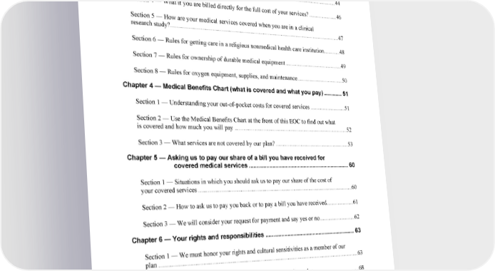 4 2024 Evidence of Coverage for WA PEBB Kaiser Permanente Senior Advantage Table of Contents Section 2 — Use providers in our network to get your medical care .....................................40 Section 3 — How to get services when you have an emergency or urgent need for care or during a disaster ..........................................................................................................44 Section 4 — What if you are billed directly for the full cost of your services? .....................46 Section 5 — How are your medical services covered when you are in a clinical research study? ........................................................................................................................47 Section 6 — Rules for getting care in a religious nonmedical health care institution ............48 Section 7 — Rules for ownership of durable medical equipment ..........................................49 Section 8 — Rules for oxygen equipment, supplies, and maintenance ..................................50 Chapter 4 — Medical Benefits Chart (what is covered and what you pay) ............ 51 Section 1 — Understanding your out-of-pocket costs for covered services ..........................51 Section 2 — Use the Medical Benefits Chart at the front of this EOC to find out what is covered and how much you will pay ..................................................................................52 Section 3 — What services are not covered by our plan? ......................................................53 Chapter 5 — Asking us to pay our share of a bill you have received for covered medical services ................................................................. 60 Section 1 — Situations in which you should ask us to pay our share of the cost of your covered services .............................................................................................................60 Section 2 — How to ask us to pay you back or to pay a bill you have received ....................61 Section 3 — We will consider your request for payment and say yes or no ..........................62 Chapter 6 — Your rights and responsibilities .......................................................... 63 Section 1 — We must honor your rights and cultural sensitivities as a member of our plan .........................................................................................................................................63 Section 2 — You have some responsibilities as a member of our plan .................................68 Chapter 7 — What to do if you have a problem or complaint (coverage decisions, appeals, complaints) ....................................................... 69 Section 1 — Introduction ........................................................................................................69 kp.org