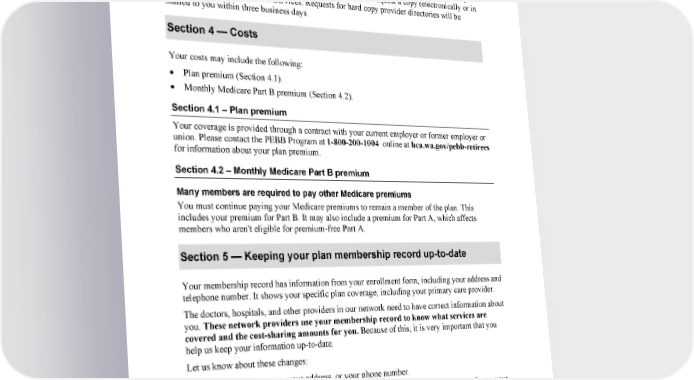 26 2024 Evidence of Coverage for WA PEBB Kaiser Permanente Senior Advantage Chapter 1: Getting started as a member unreasonable or not possible to obtain services in-network), out-of-area dialysis services, and cases in which our plan authorizes use of out-of-network providers. The most recent list of providers and suppliers is available on our website at kp.org/directory. If you don't have your copy of the Provider Directory, you can request a copy (electronically or in hardcopy form) from Member Services. Requests for hard copy provider directories will be mailed to you within three business days. Section 4 — Costs Your costs may include the following: • Plan premium (Section 4.1). • Monthly Medicare Part B premium (Section 4.2). Section 4.1 – Plan premium Your coverage is provided through a contract with your current employer or former employer or union. Please contact the PEBB Program at 1-800-200-1004 online at hca.wa.gov/pebb-retirees for information about your plan premium. Section 4.2 – Monthly Medicare Part B premium Many members are required to pay other Medicare premiums You must continue paying your Medicare premiums to remain a member of the plan. This includes your premium for Part B. It may also include a premium for Part A, which affects members who aren't eligible for premium-free Part A. Section 5 — Keeping your plan membership record up-to-date Your membership record has information from your enrollment form, including your address and telephone number. It shows your specific plan coverage, including your primary care provider. The doctors, hospitals, and other providers in our network need to have correct information about you. These network providers use your membership record to know what services are covered and the cost-sharing amounts for you. Because of this, it is very important that you help us keep your information up-to-date. Let us know about these changes: • Changes to your name, your address, or your phone number. • Changes in any other health insurance coverage you have (such as from your employer, your spouse or domestic partner's employer, workers' compensation, or Medicaid). • If you have any liability claims, such as claims from an automobile accident. • If you have been admitted to a nursing home. • If you receive care in an out-of-area or out-of-network hospital or emergency room. kp.org