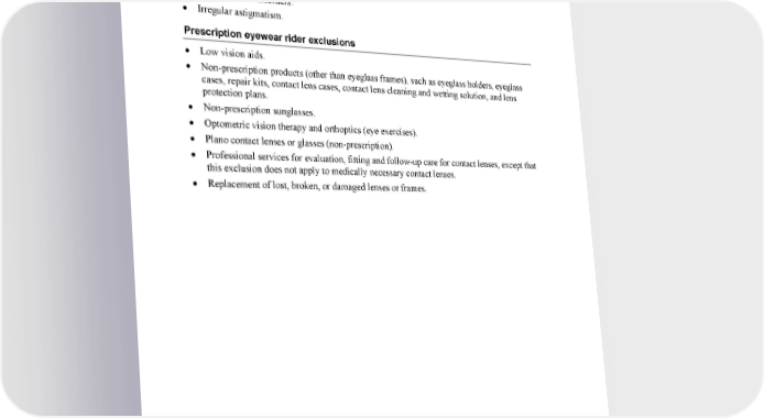 • Aphakia. • Anisometropia. • Aniseikonia. • Aniridia. • Corneal disorders. • Post-traumatic disorders. • Irregular astigmatism. Prescription eyewear rider exclusions • Low vision aids. • Non-prescription products (other than eyeglass frames), such as eyeglass holders, eyeglass cases, repair kits, contact lens cases, contact lens cleaning and wetting solution, and lens protection plans. • Non-prescription sunglasses. • Optometric vision therapy and orthoptics (eye exercises). • Plano contact lenses or glasses (non-prescription). • Professional services for evaluation, fitting and follow-up care for contact lenses, except that this exclusion does not apply to medically necessary contact lenses. • Replacement of lost, broken, or damaged lenses or frames. RSAVX2CY0124 2